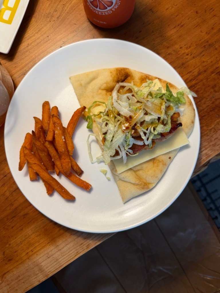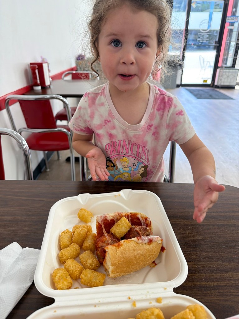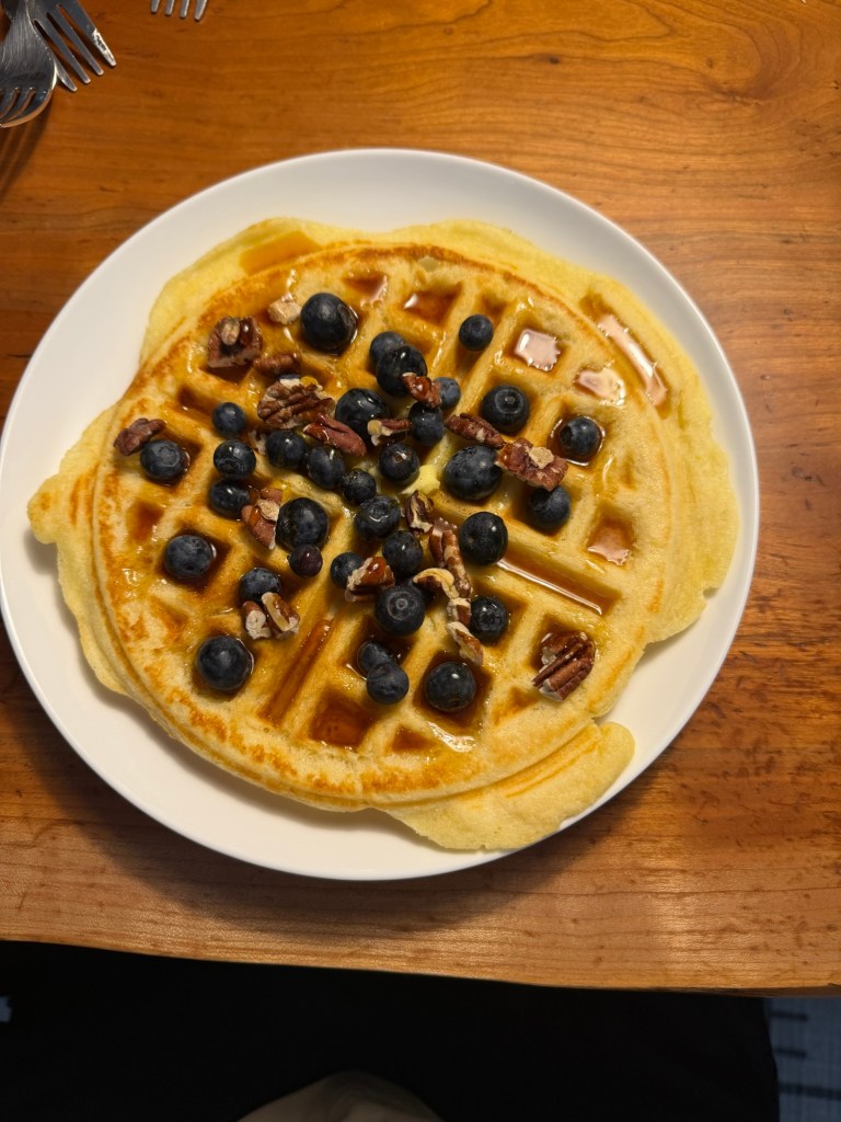 Saturday started with lemon ricotta waffles. So good! Look how cute the kids look together — too bad they were watching TV on Joey’s phone after they stole it from him 😂 Mid-morning Joey and Lydia headed out to her swim lesson, followed by race packet pick up and lunch, while Dempsey and I headed to a birthday party. When we got there, they had the street totally shut down and a giant climbing wall set up outside their house! He was NOT about trying it, but we hung out, played games, shot silly string and ate pizza before heading home. We had a pretty low-key rest of the day and I made us Portuguese-style chili chicken wraps for dinner. We all demolished them! Tried to get the kids to bed early but they were so wound up that they ended up going to bed later than usual. Make it make sense!