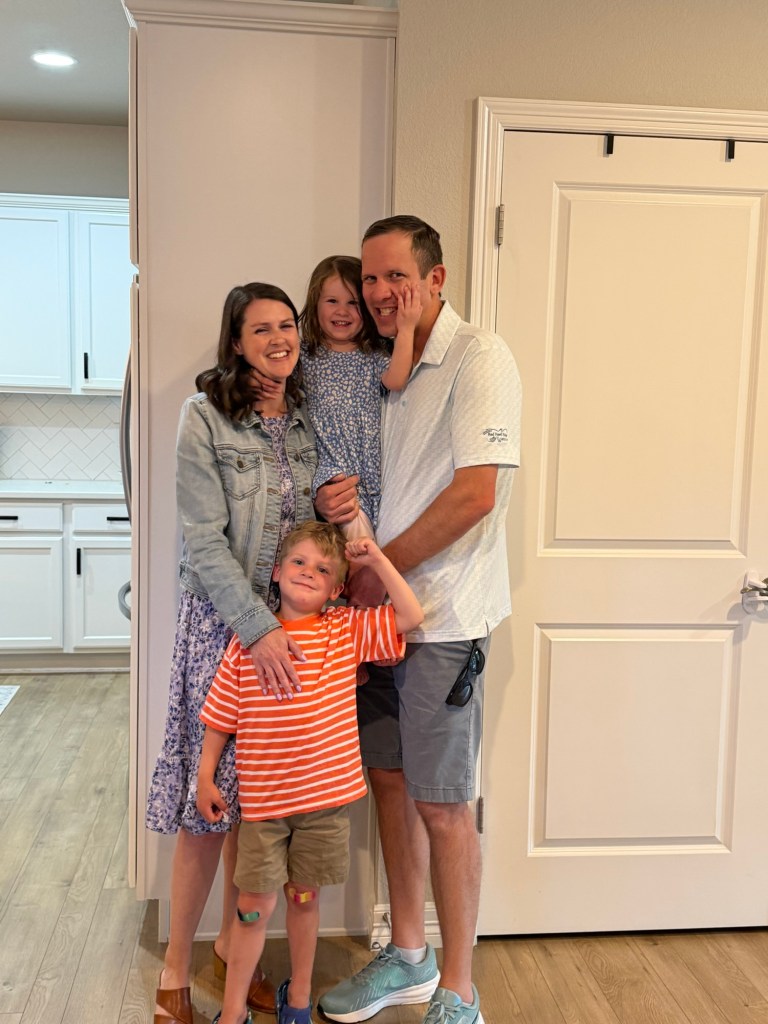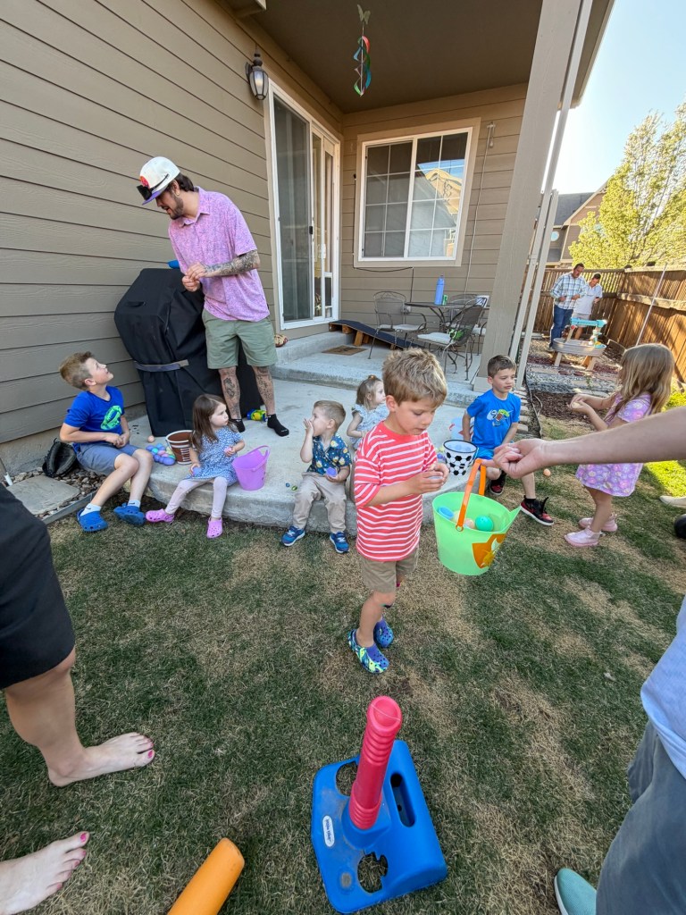 Back at home, Lydia was starting to melt down, so I took her upstairs and she actually fell asleep for a proper nap, not in the car 😂🙌 While she was down, I got ready, baked the rolls and then remembered I had to make salads for the week. Whyyyyyy. Got those done, then rushed to get the kids dressed and in the car to head over to Lauren, Adam and Landon’s for Easter dinner. My poor kids are always so shy and overwhelmed entering places with lots of people and noise, so they were both just hanging from me but they got over it quick. We all visited, ate dinner and dessert and then the dads hid eggs in the backyard for the kids to hunt. On the way over, Dempsey had been so nervous for this part (my sweet sensitive boy), but he was totally fine. We were the last ones out because I had to grab a family photo first and would you just look at Lydia squishing Joey and I 🥹 And I guess Dempsey was showing off his muscle (probably after all the pull ups he was doing on his cousin’s trampoline) 😂