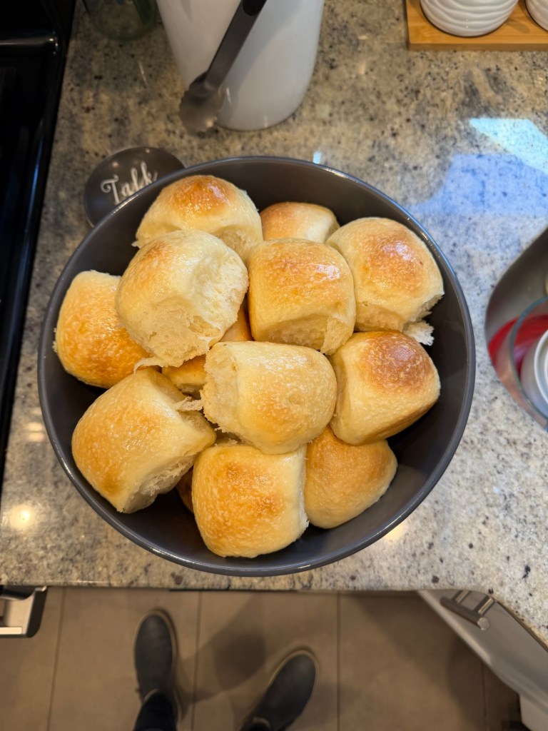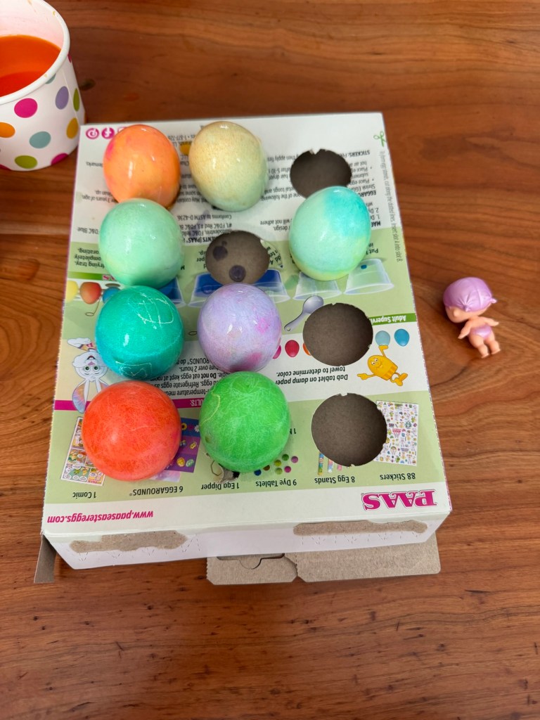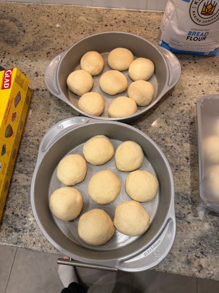 Saturday started with egg sandwiches for breakfast (and sourdough crises averted) before we dyed eggs with the kids. Took us all of ten minutes to do 😂 Dempsey did eat one afterward but I can’t wait to just have the rest in the fridge for a month 😅 Joey got a new projector screen for our outdoor movie nights, so he and Dempsey set it up and they watched a movie in the playroom while I started my dough for Easter rolls. Tried really hard to get my daughter to take a nap but she protested then fell asleep in the car on the way to Benihana for Birthday Dinner #2. That girl! We all had a fun time and the kids ate so well. I was impressed! Got those crazy kiddos to bed, then rolled 24 dough balls while Joey arranged the kids’ Easter baskets.
