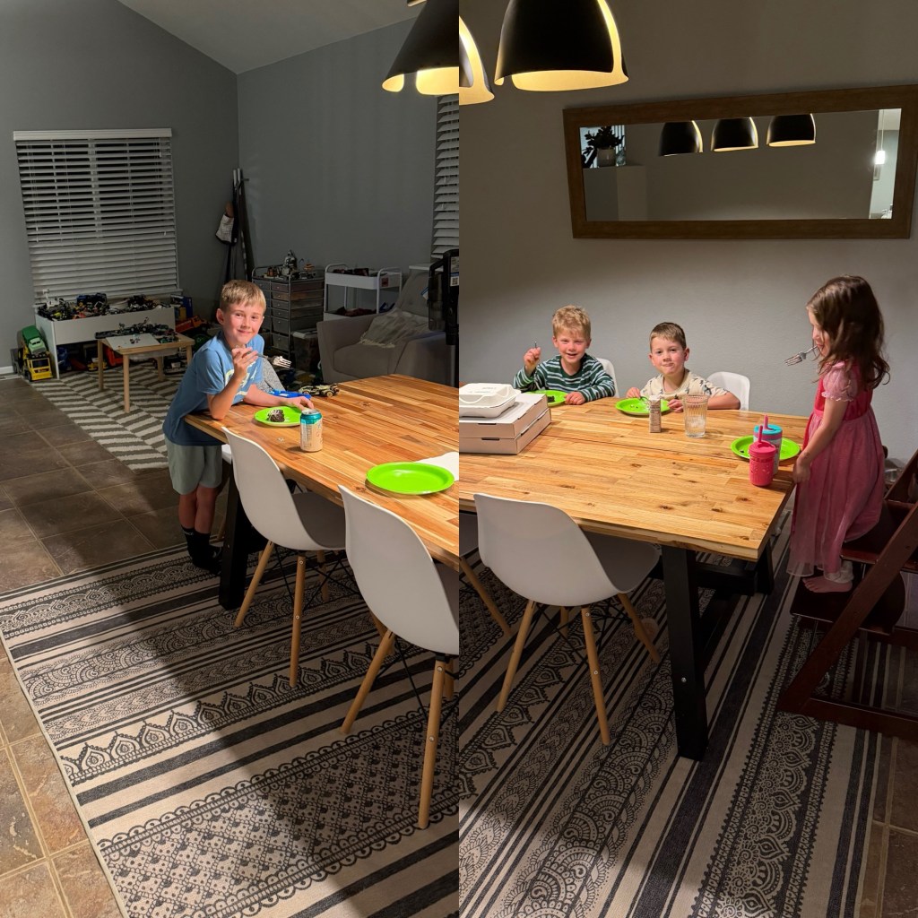 Friday, I took Dempsey to school and he was my little assistant on a project we’re arranging for Teacher Appreciation Week 🥹 Afterward, I went back home and worked, but just know that I accidentally told Hannah and Josh that I have Fridays off, so let that speak to how much work I actually did 😂😂 We headed over to their house for dinner and so the kids could run around screaming their little heads off. I asked Joey to take a picture of them all eating their dessert, but poor Mason was in one all by himself, so I cropped them together 😋 Lydia must’ve rubbed her eyes after she touched Avery because she started to swell up, but we were about to head home anyways. I’m so glad Dempsey and Henry have each other, it’s so fun watching them play!