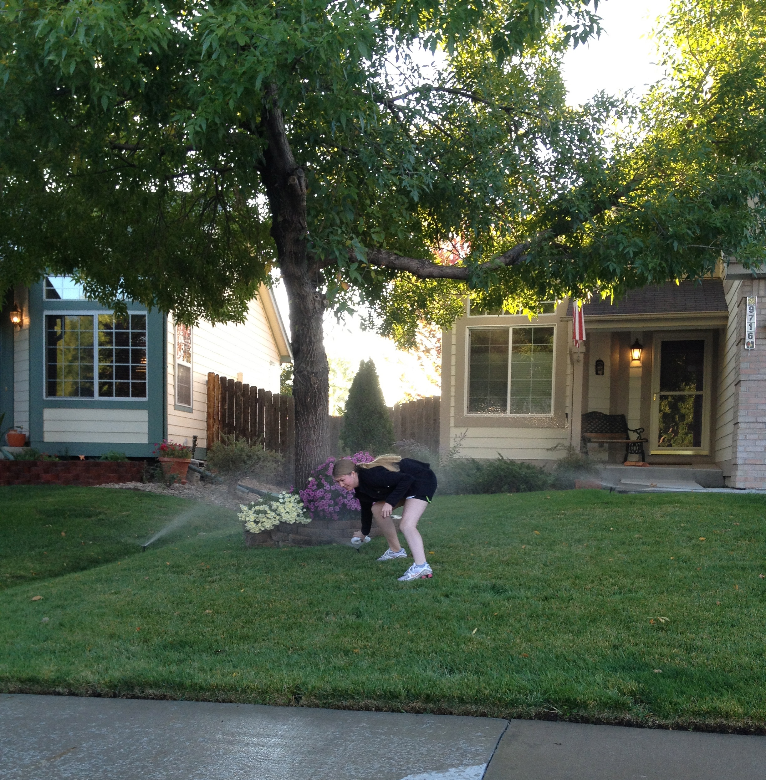 Here’s Hannah wetting a washcloth in her neighbor’s sprinkler so we can use it to put our race tattoos on in the car.  Totally  normal.
