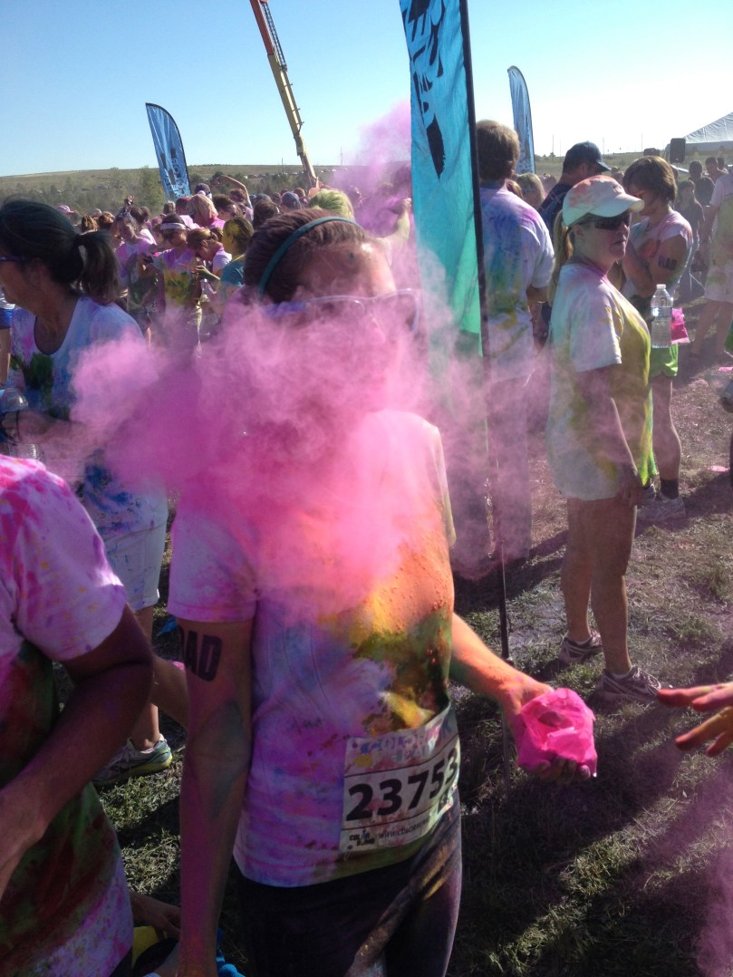 You got your color packet with your race packet for the Color Run and although you were supposed to wait to open it till after the race, lots of people didn’t.  It was kind of cool to start the race already all colored up, but you also had to hold onto it while running.  For Color Me Rad, you just grabbed the color packet before crossing the finish.  Not sure which I preferred.  How about one packet for before and one for after??