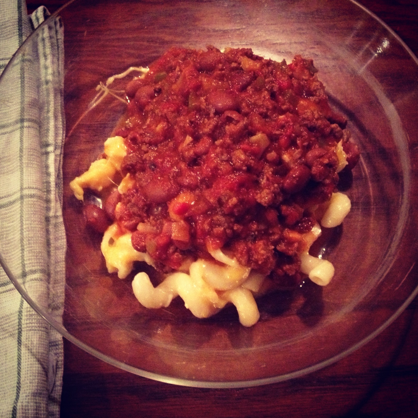 And who has the brilliant idea to cook some chili then cook some mac and cheese and layer the one over the other.