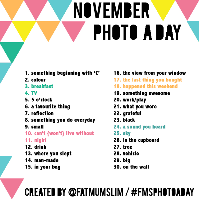 Back to the photo-a-day thing. Every month, the author behind the Fat Mum Slim blog puts out the monthly challenge list and social media outlets are flooded with interpretations of the theme of the day. I’d never done it before but came across the November list and thought it’d be fun.