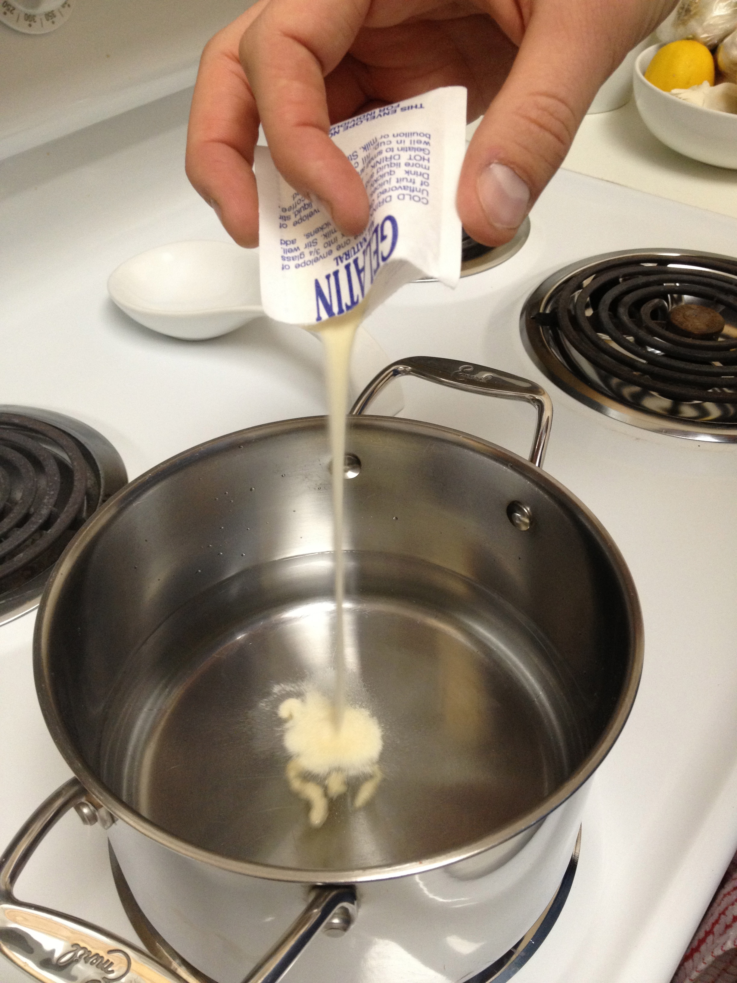 2. Pour 4 cups water in a saucepan and sprinkle with 4 envelopes of gelatin.  Let soak 1-2 minutes, then heat over low, stirring constantly until gelatin has dissolved (~5 minutes).