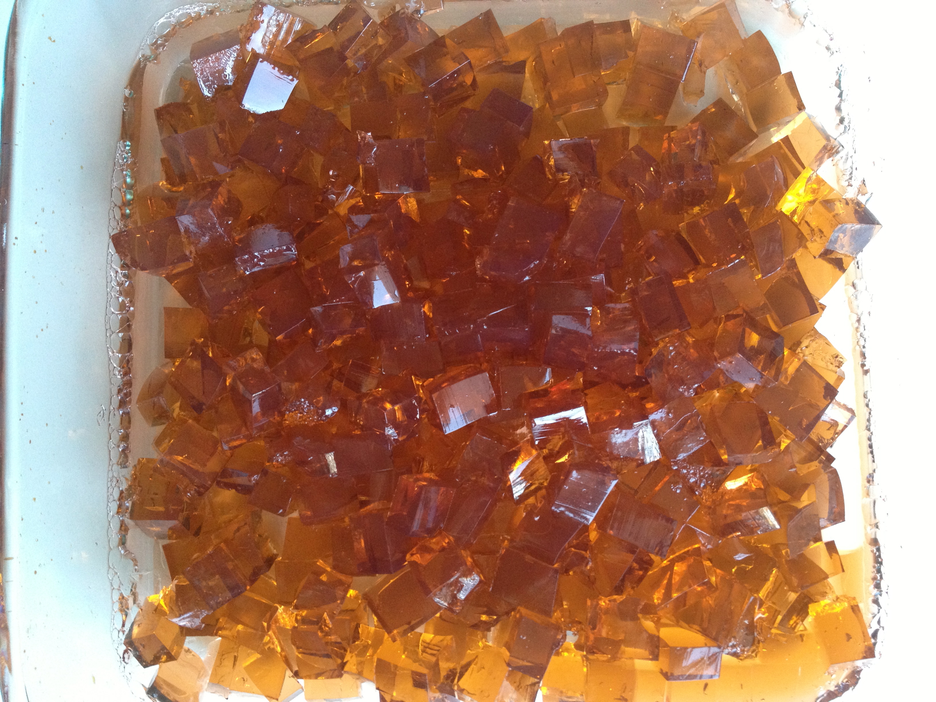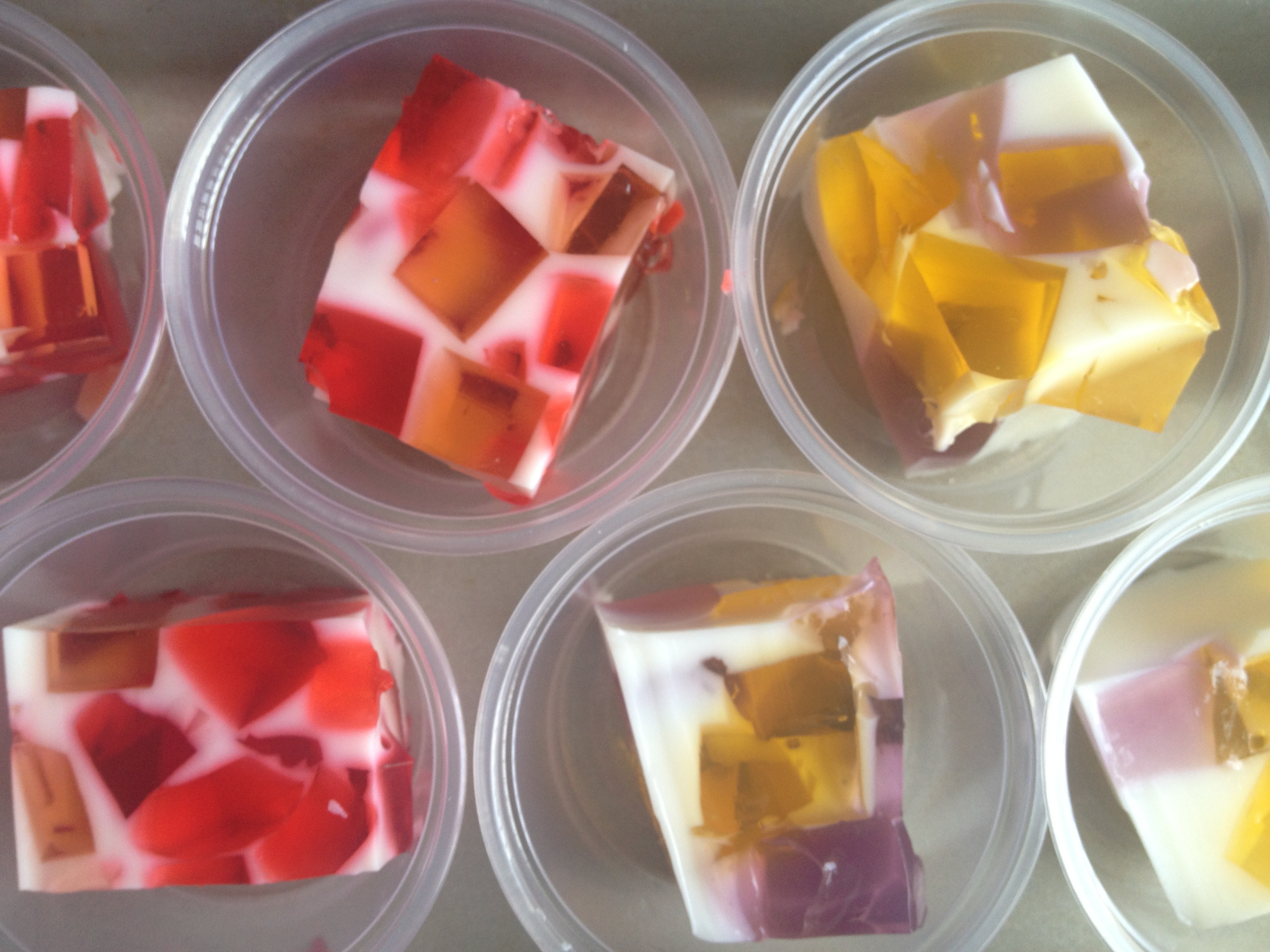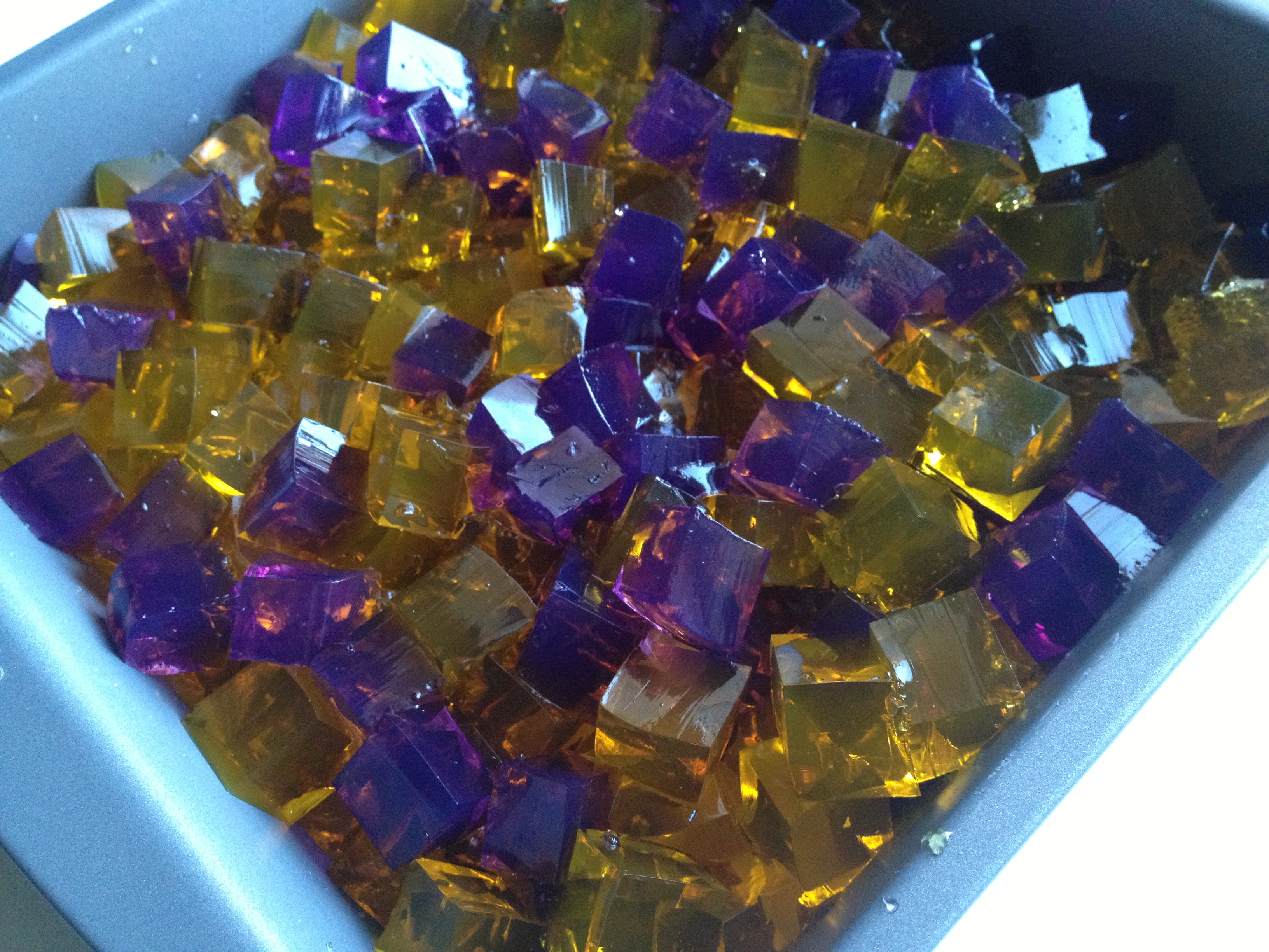 2. Cut colored Jell-O into small blocks and mix each pair of team colors as desired in 2 8X8 dishes.