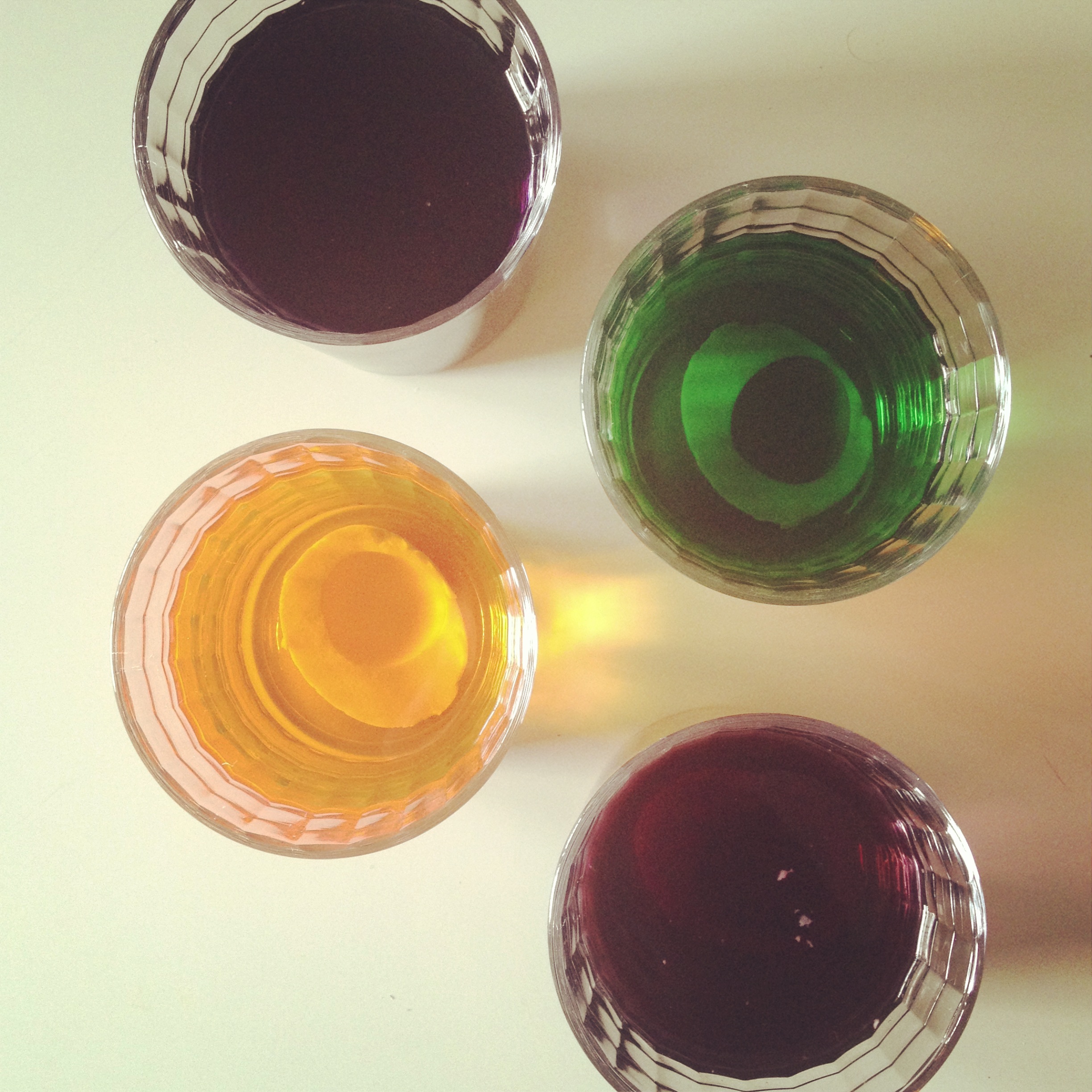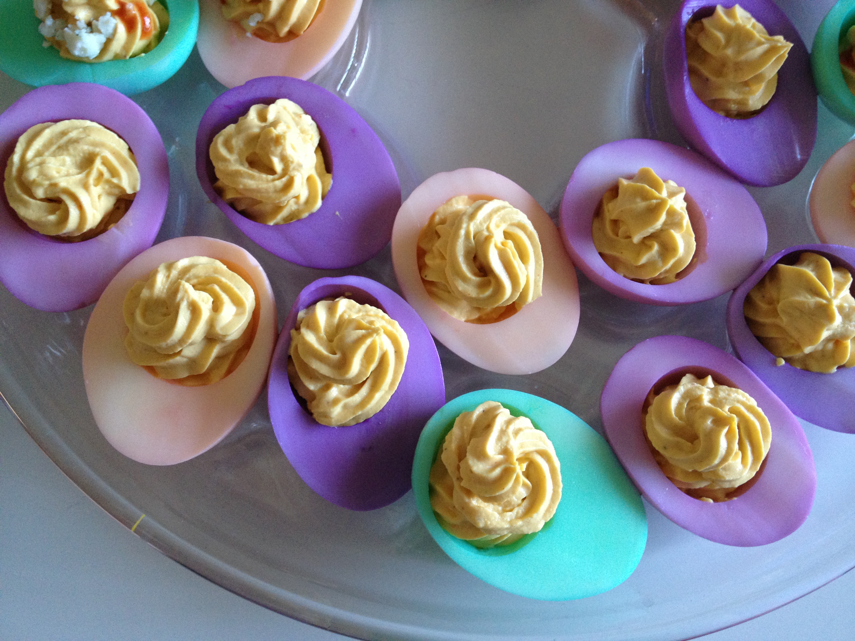 I came across this page last week and immediately volunteered myself for deviled egg duty. I ended up doubling the food coloring amounts (tripling it in the case of the green and orange eggs) and letting the eggs soak for about 45 minutes.