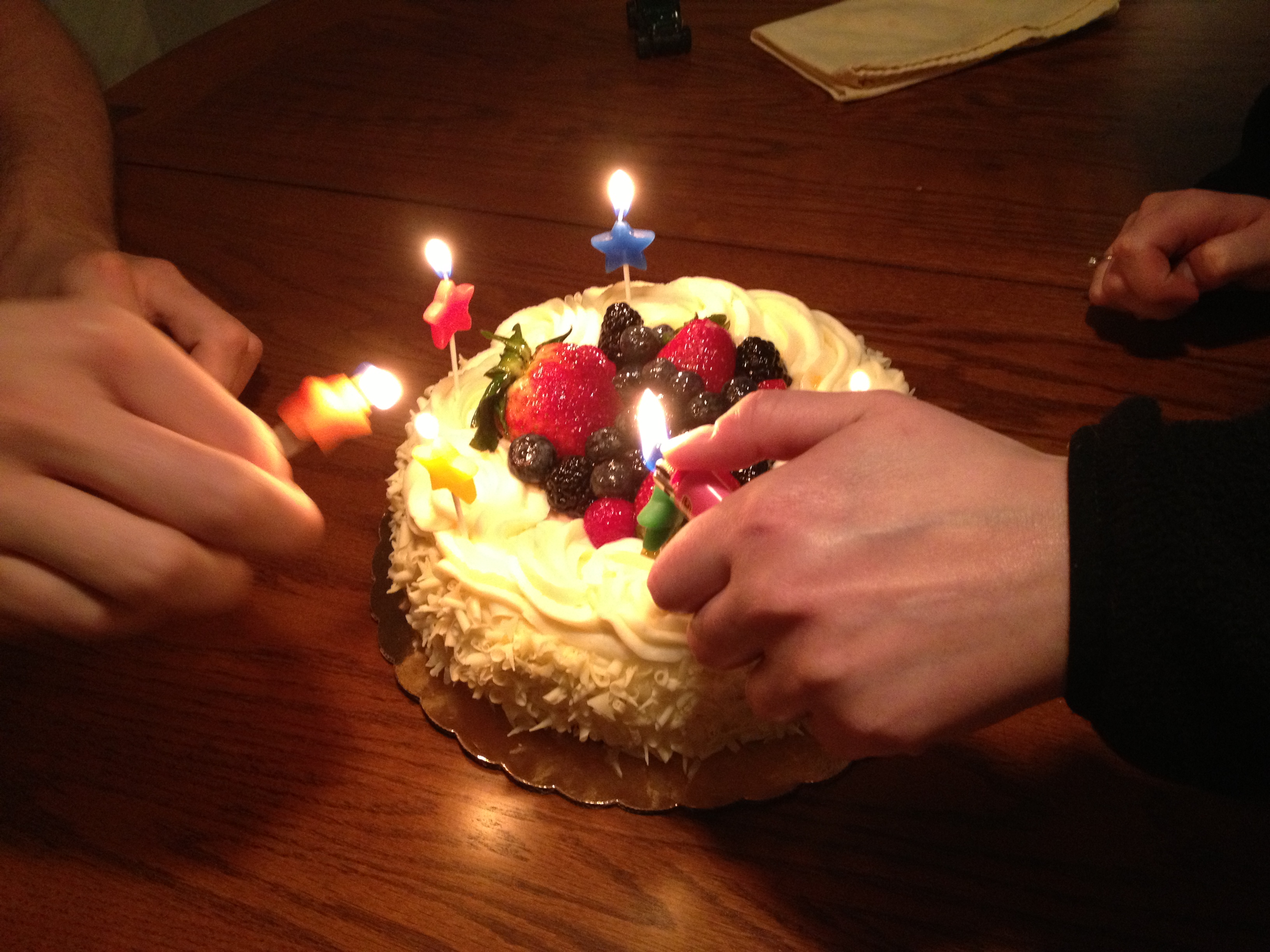 After dinner, we pulled out the celebratory chantilly cake for Joey’s birthday. Or, more likely, because we all go crazy over this chantilly cake and Joey’s birthday seemed like a good excuse to buy one. The thing is almost too pretty to eat. Almost.