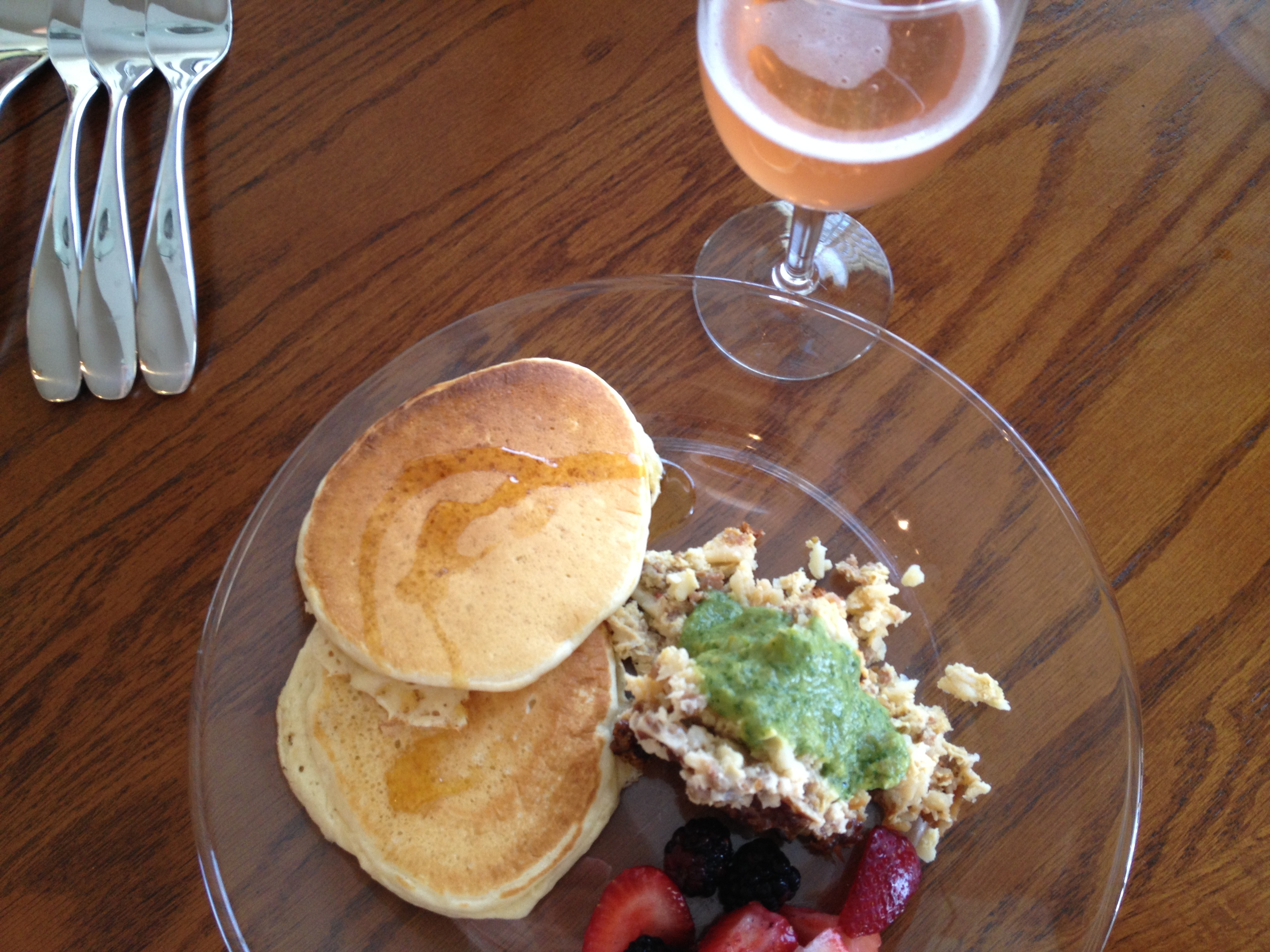 I’d never made a Bellini before, but it basically amounted to mixing the strawberry simple syrup with a bottle of Prosecco and they turned out really good. They also turned out to be the same color as this “sherbet” shirt Joey just bought. Four of us easily finished the whole batch. I think Joey drank one in his mom’s honor. She’s sick and couldn’t make it to breakfast 😦