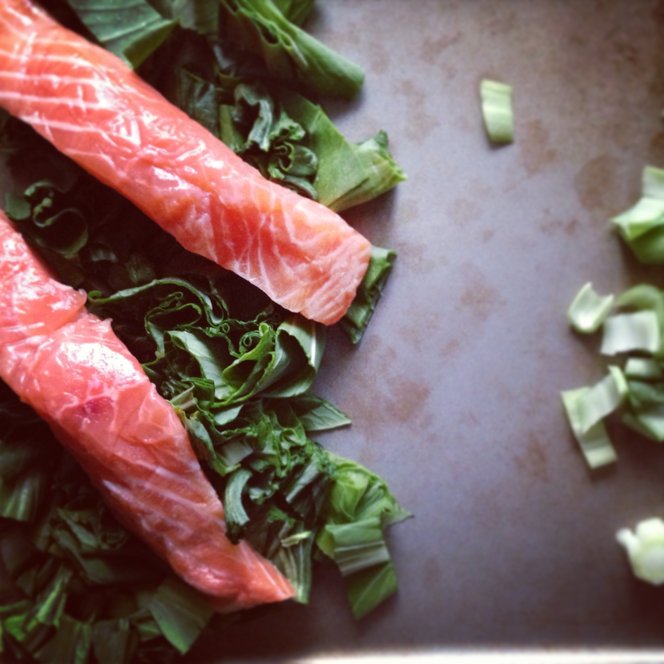The bok choy was served alongside some salmon in this recipe. In fact, we made this for a late dinner on Monday after picking up our second batch of CSA goodies. It took all of 15 minutes and was so dang tasty. Our salmon was on the thicker side so we ran into some trouble with the cooking time difference between the sauce/bok choy and the salmon but overall, I loved this dish. My mom is probably also repulsed by this picture of “stinky fish.”