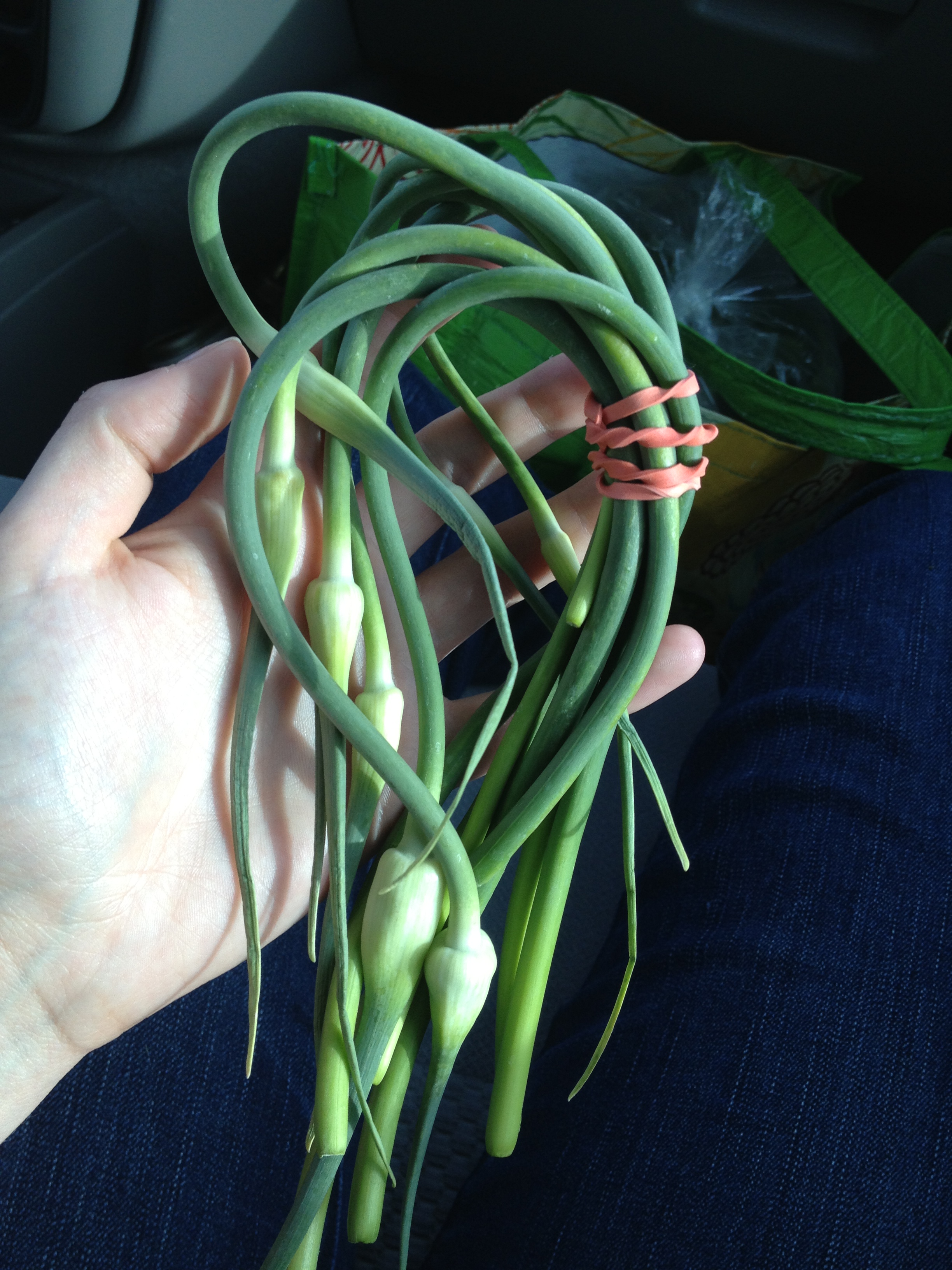 Also, this is what garlic scapes look like, for any of you who’ve never come across this weird looking produce. They’re usually even more weird looking, but it’s the end of garlic scape season, so this happens to be a smaller bunch.