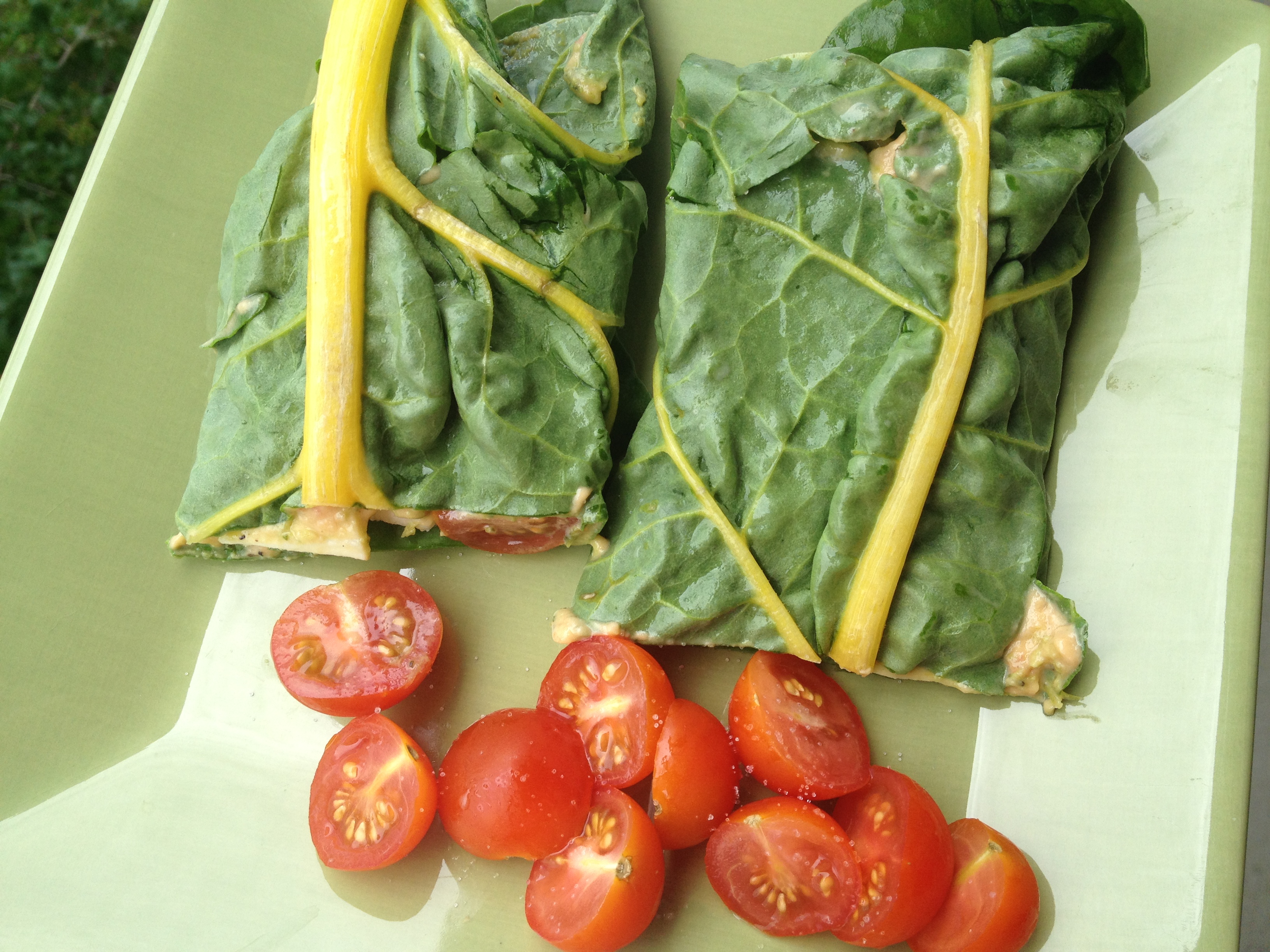 Okay, stay with me on this one. I was at a serious loss for what to do with the Swiss chard. It was actually Joey who suggested I use the leaves as a wrap. I just smeared some hummus and pesto on the leaves then tossed in some cheese and cherry tomatoes. Plus a good sprinkle of salt and pepper, of course, it wasn’t half bad and I’ll admit I repeated this meal a few times. Still, I think I could do with any more chard in our CSA bundle.