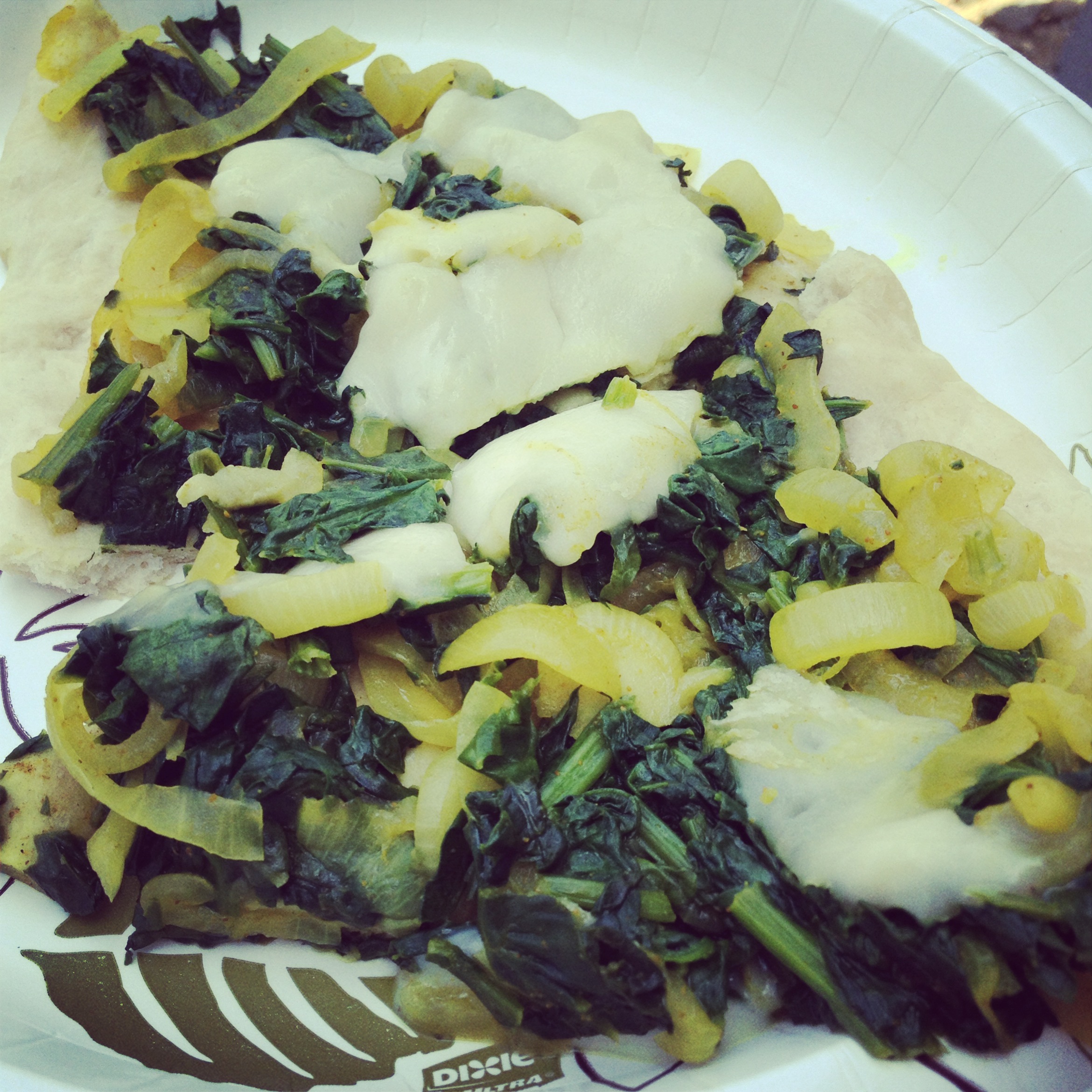 The spinach went to good use in a homemade pizza. We just sautéed some onion and spinach and tossed it on some pizza dough — homemade, mind you! — then topped it all off with some fresh mozzarella. I can’t remember the first time I ate fresh mozzarella, but I imagine it being a very strange taste if you’ve never tried it before. And I mean plain, not inside a fried breading!