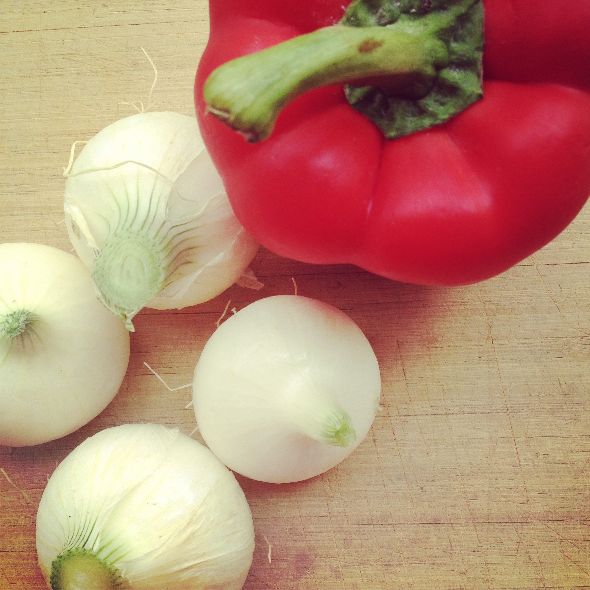 How cute are these onions?! That red bell pepper is supposed to help you gauge their size. I’m pretty sure all 4 amount to one normal grocery store-sized onion. I love them. And I used them for something else I love; Stacked Roasted Vegetable Enchiladas. Nothing beats making a casserole for an easy reheat and eat lunch option, right? Right! Plus what’s not to love about 3 layers of cheese? Also, I made my own enchilada sauce. Hey look, I’m a domestic!