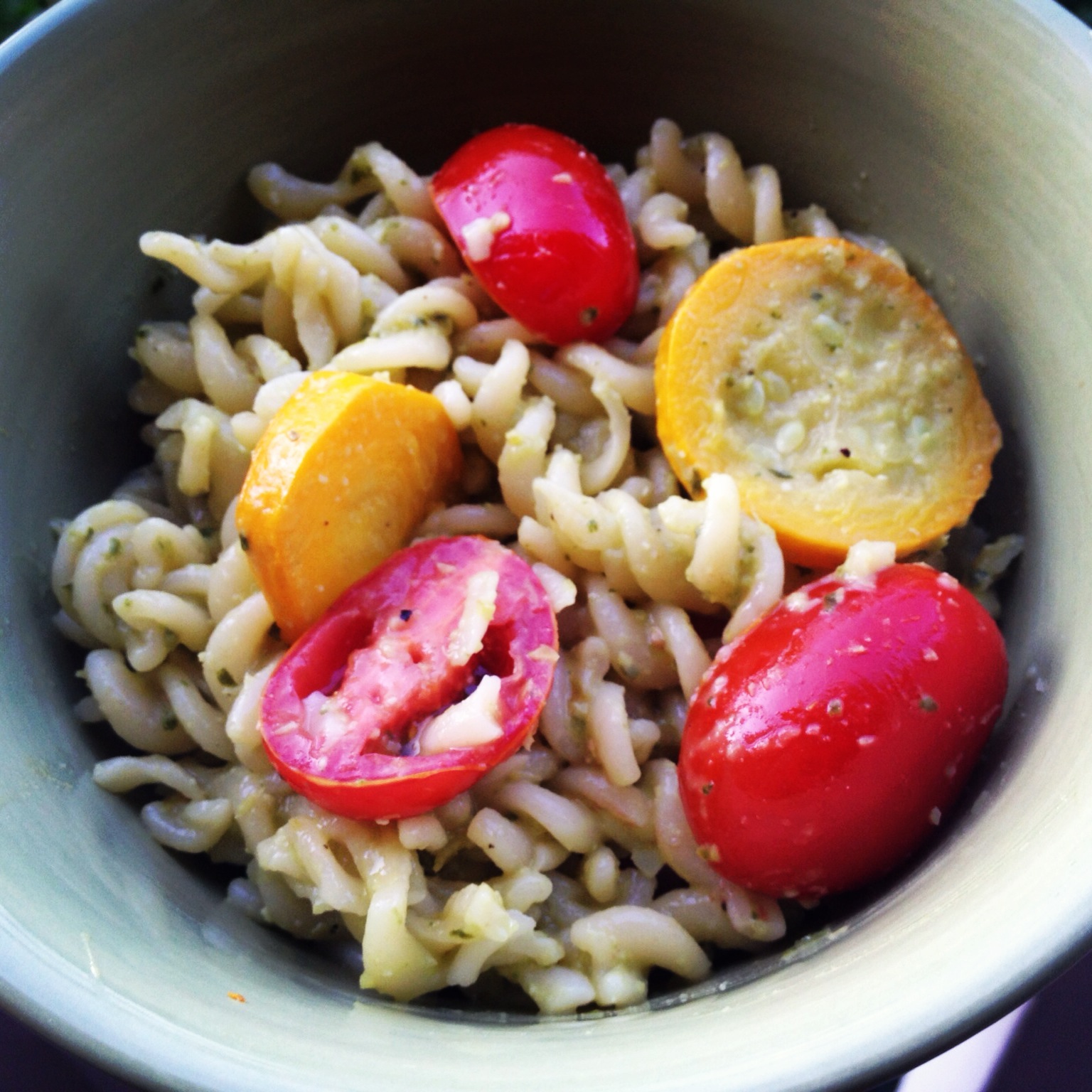 We like to have something super quick and easy on our menu for the night that we actually do our pick-up since it takes a good 45 minutes to get there and another 45 minutes to get back home. This week’s no-brainer dinner was pesto pasta (we already had the pesto made from garlic scape week) and decided to sauté up one of the zucchs to mix in with the pasta and cherry tomatoes. This meal was so simple but also really flavorful. The pesto makes it!