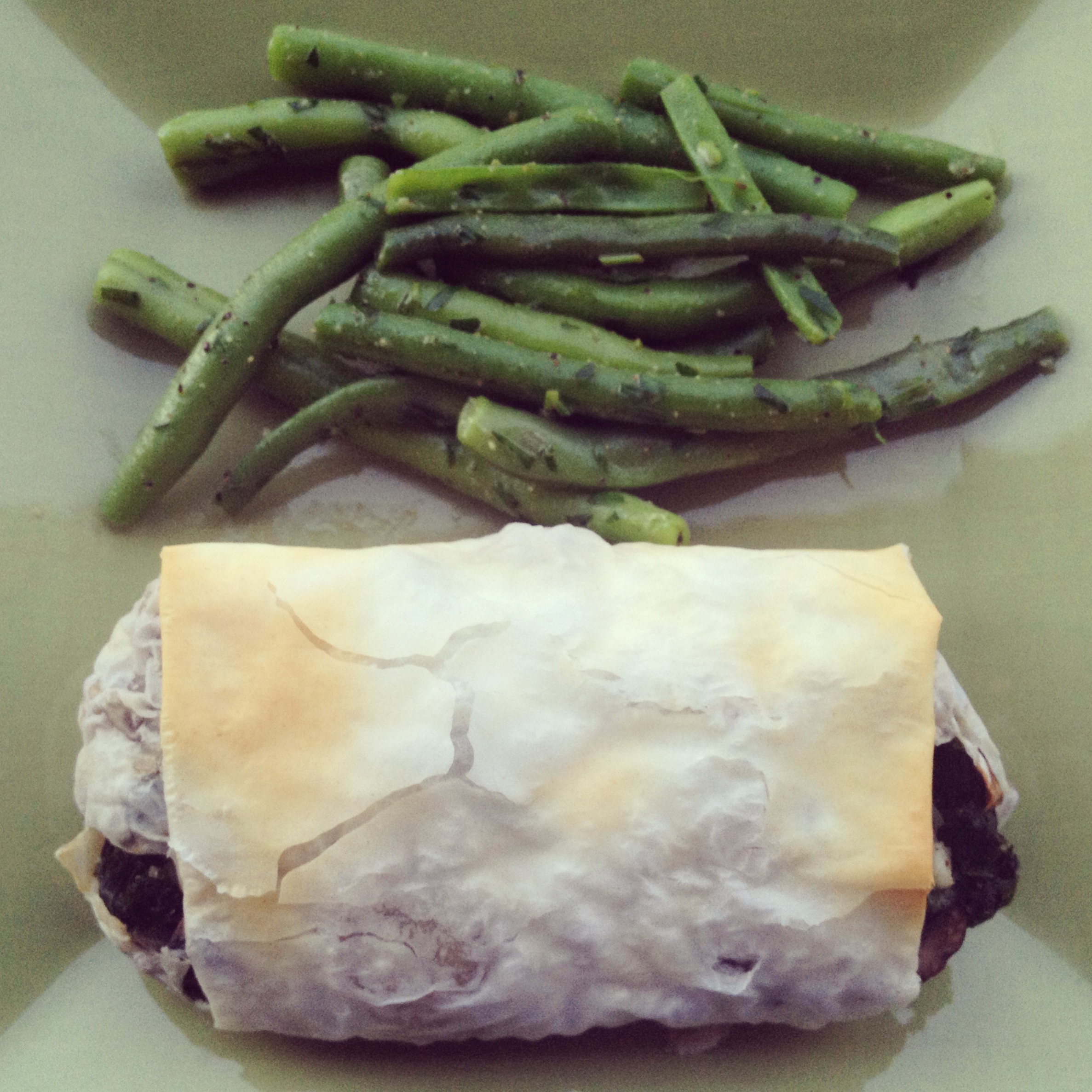 For the kale, we used this recipe for inspiration and changed it up a little bit by doubling the filling, adding some shredded mozzarella and making 8 smaller phyllo wraps. We had a little phyllo wrap assembly line going. We filled this particular one a little too much, hence the filling bursting out at both ends (doh!). Despite the fact that farm fresh kale kind of freaks me out (it’s like you can never really get it clean!), these were pretty good. I say “pretty good” because they really could have used some goat cheese to take them to the next level. Oh, and this is where the onions went too.