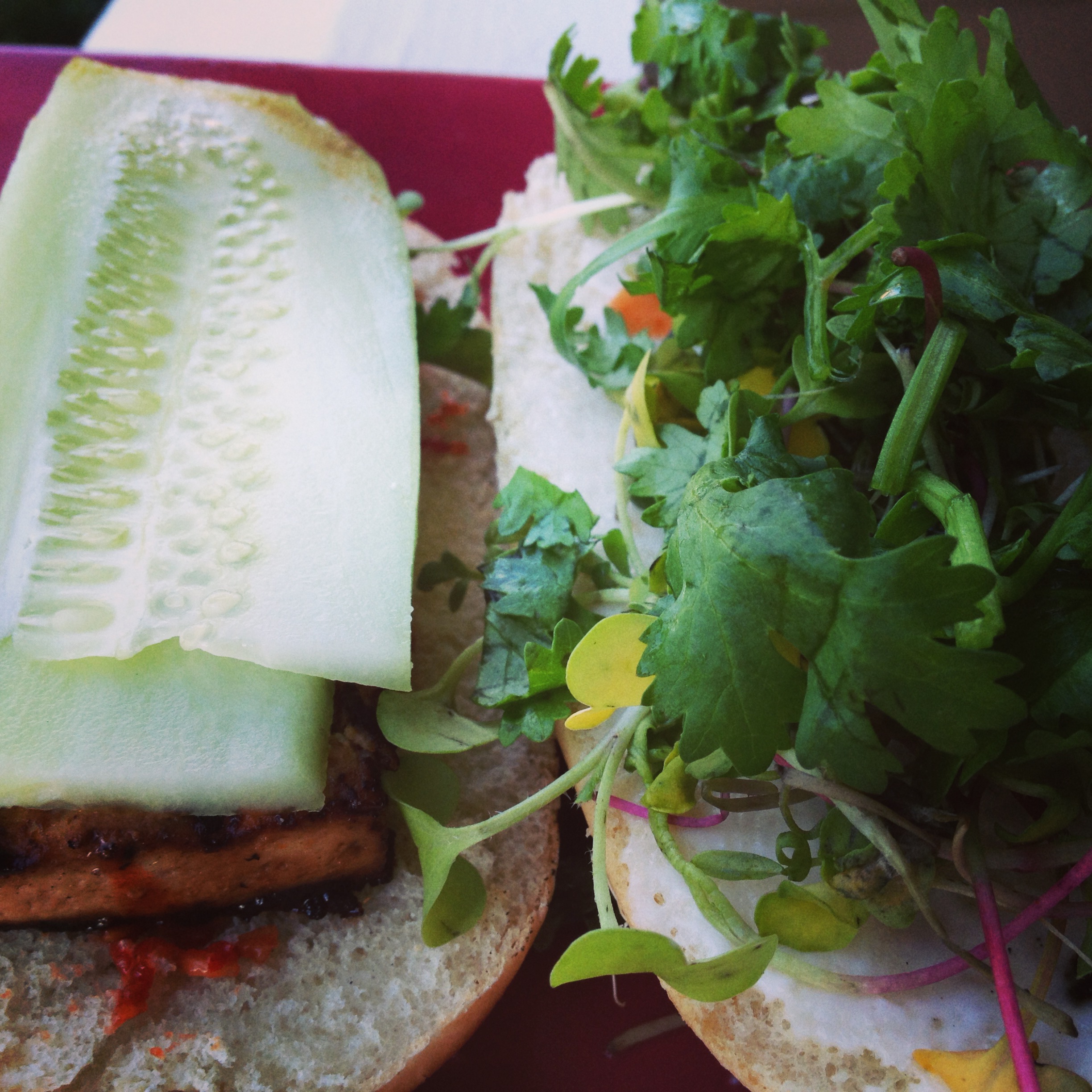 If you’re thinking these carrots look a little too much like human fingers for comfort, well then, you and me both, sister. Even more so after I roasted them… But aren’t the yellow insides of those purple carrots awesome?? I definitely wasn’t expecting that when I sliced into one. Anyways, these sandwiches were okay. I probably won’t go through the trouble of making them again, but it was a good way to use up our cucumber. The hoagie rolls were the star of the show anyways.