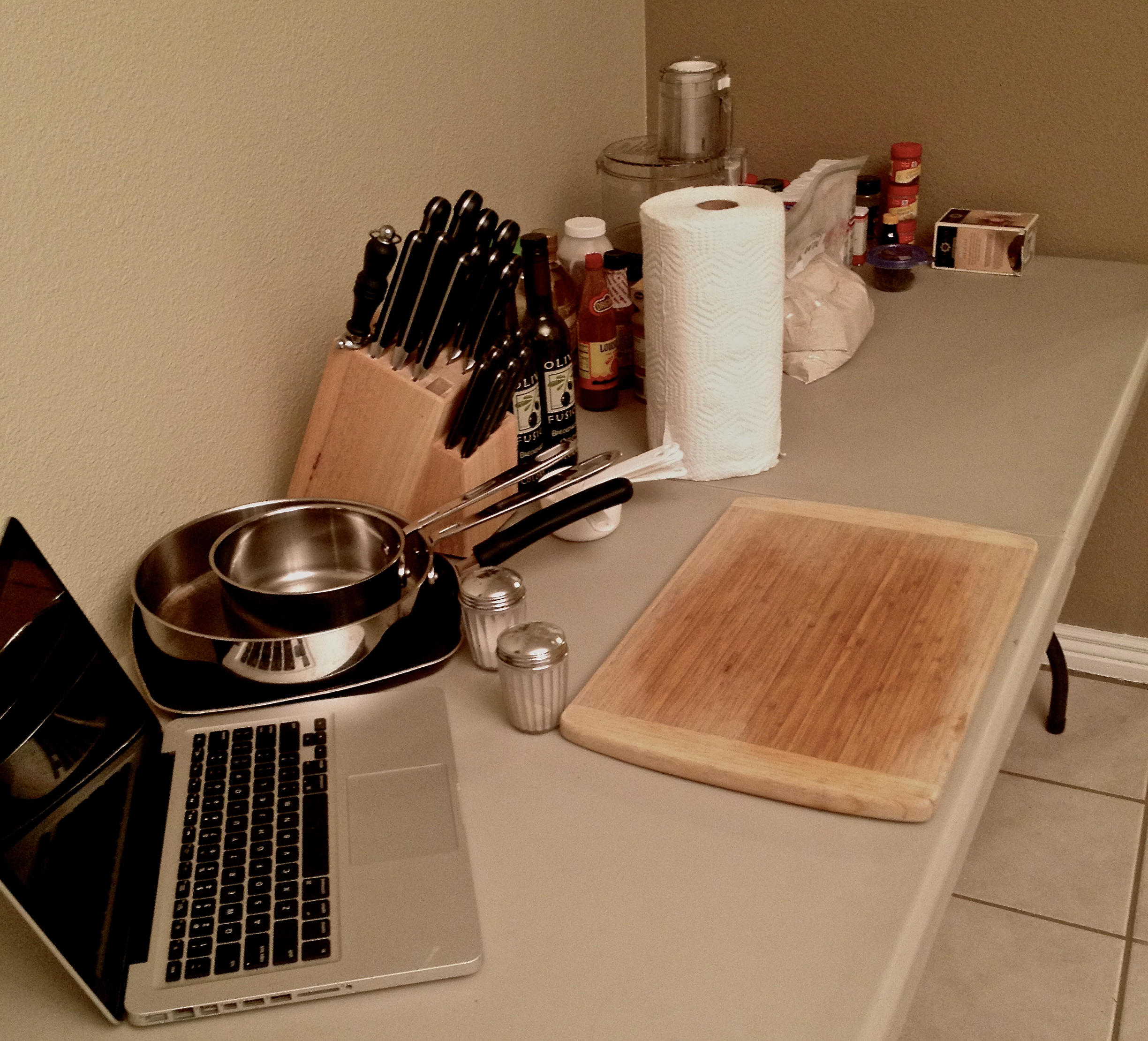 We’re almost 100% sure we want to put in an island, but until a series of other things happen (wall demo, hardwood flooring, cabinet re-arranging), we’re working with this folding table. Not the classiest, but pretty effective. On Monday night, I made some spinach ricotta calzones and was pretty proud. If you could see the other half of my kitchen, you would be too.