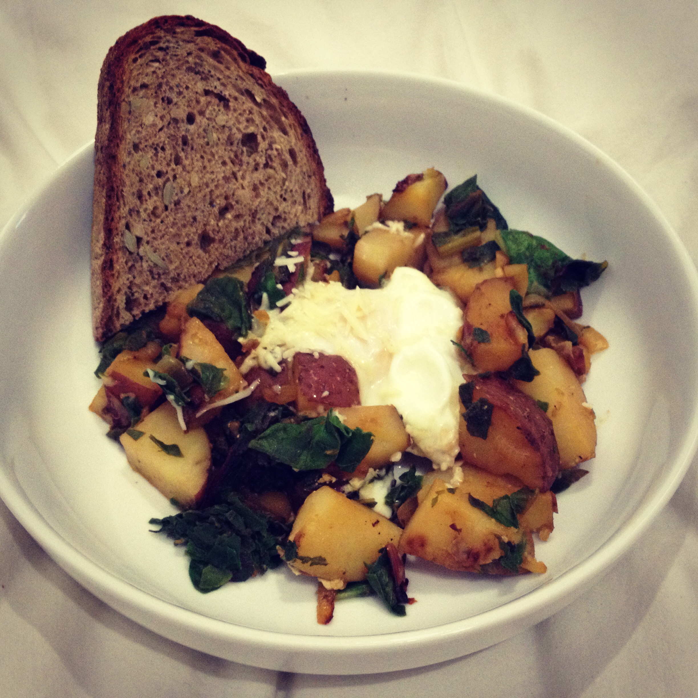 Potato & Chard Hash with an Egg on Top and Bread on the Side
