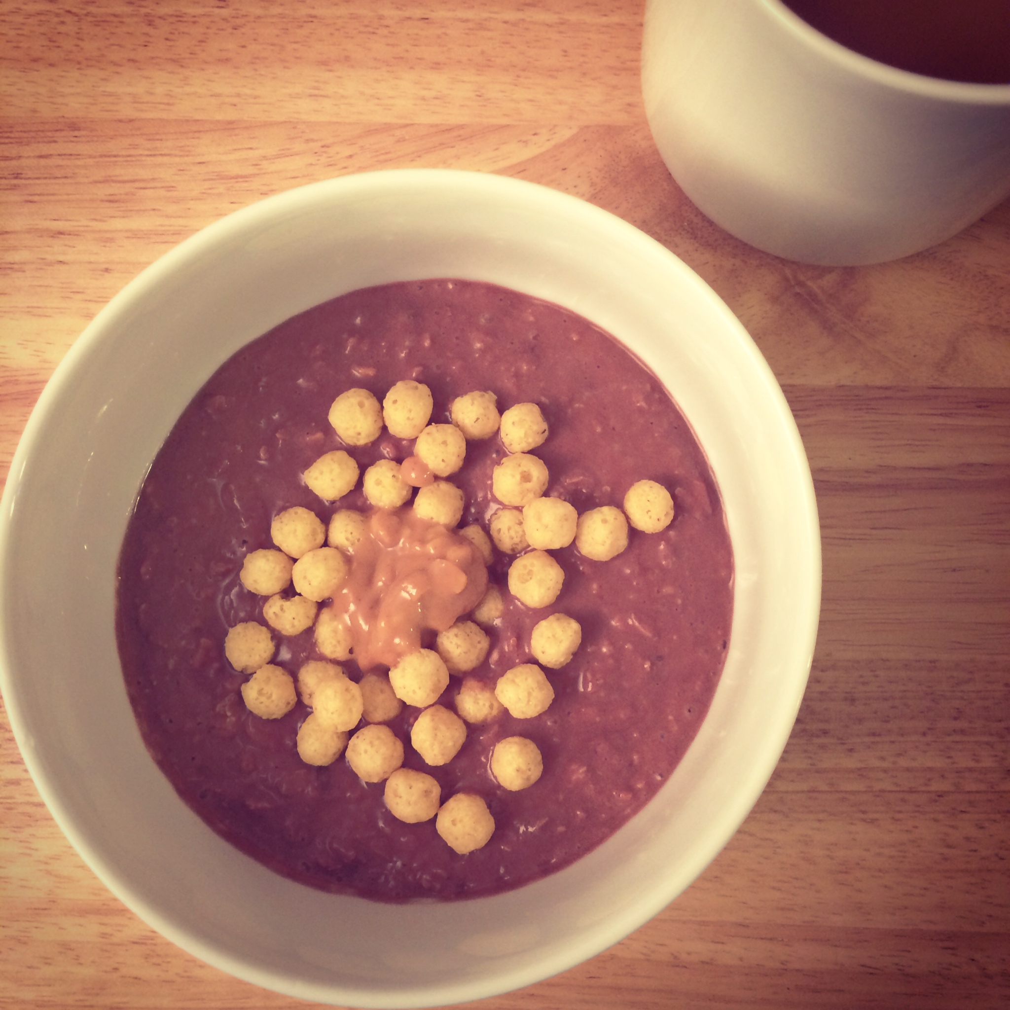The night before, I mix 1/3 cup each rolled oats, almond milk and Greek yogurt, plus 1 tablespoon each cocoa powder, maple syrup and most importantly, chocolate chips! Then you just stick the whole thing in the fridge overnight and in the morning, all you have to do is microwave it for a few seconds to take off the chill (unless you like the chill), add some fun toppings (peanut butter and Panda Puffs, for the win!) and enjoy.