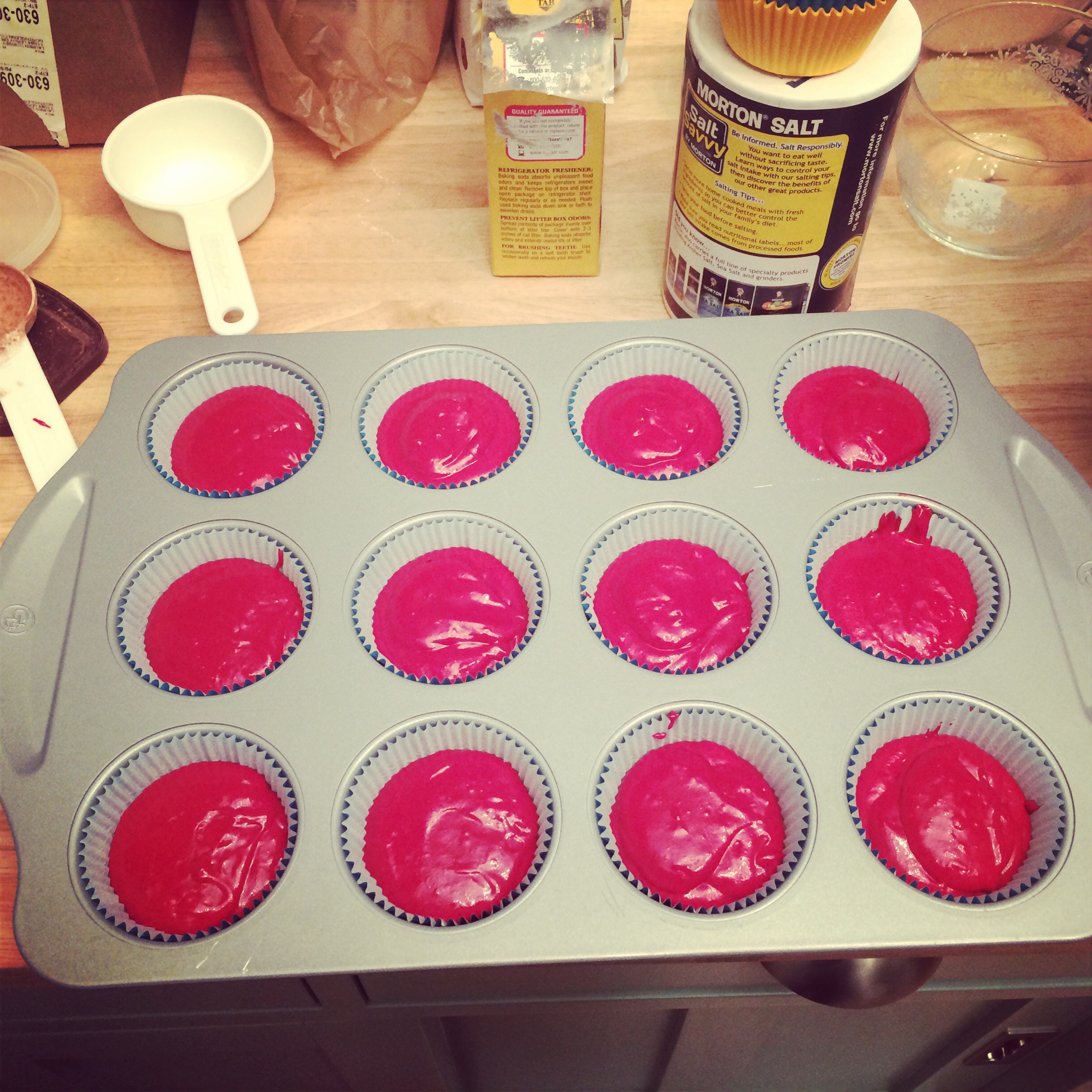 Post run I mixed a bowl of flour and milk while watching New Girl (that show just keeps getting worse and worse…) because multi-tasking is where it’s at.  And because I insisted on bringing red velvet to the (F)Easter celebration this year.  I don’t think I’ve quite mastered the cooking time on cupcakes vs. a whole cake so these were a little on the overcooked side.  C’est la vie.