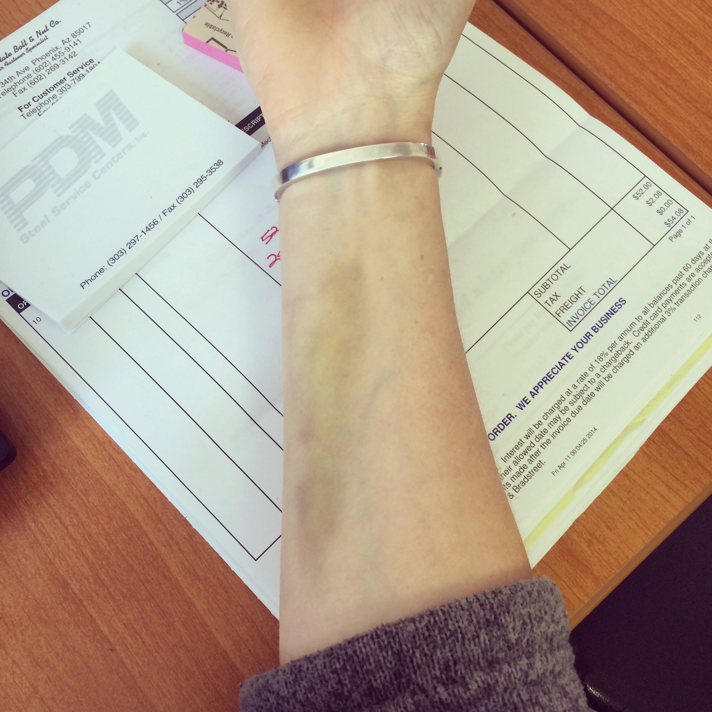 Check this one out! I wish I had a better story, but all that really happened is that I set our TV down on my arm while trying to move it last week, then slide my arm out from underneath that heavy thing and ended up with this weird bruise. For a few days, it hurt so bad that I couldn’t even hang my arm at my side without wincing. But I guess things could be worse. I could have a bruise like the one Hannah got from falling in the shower…