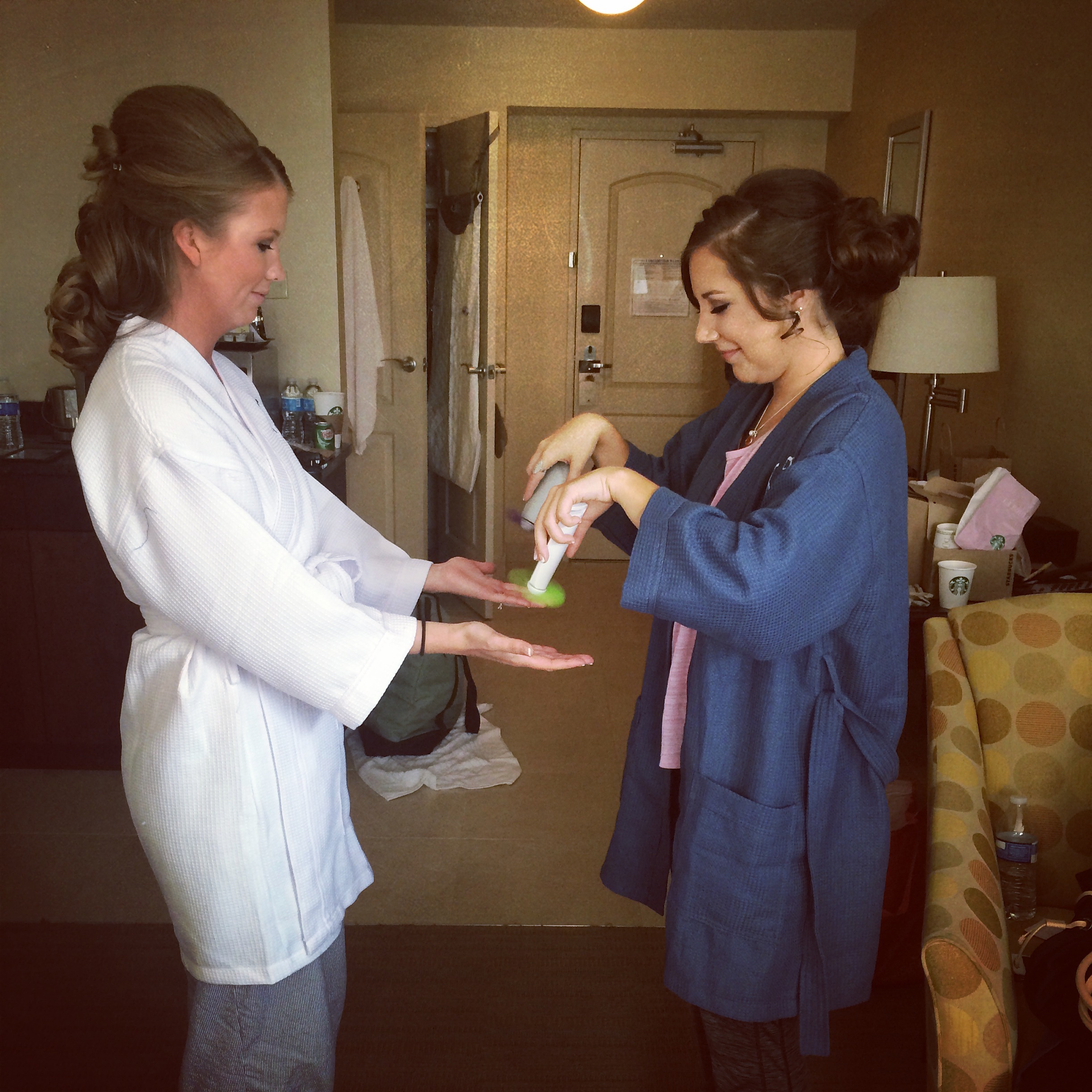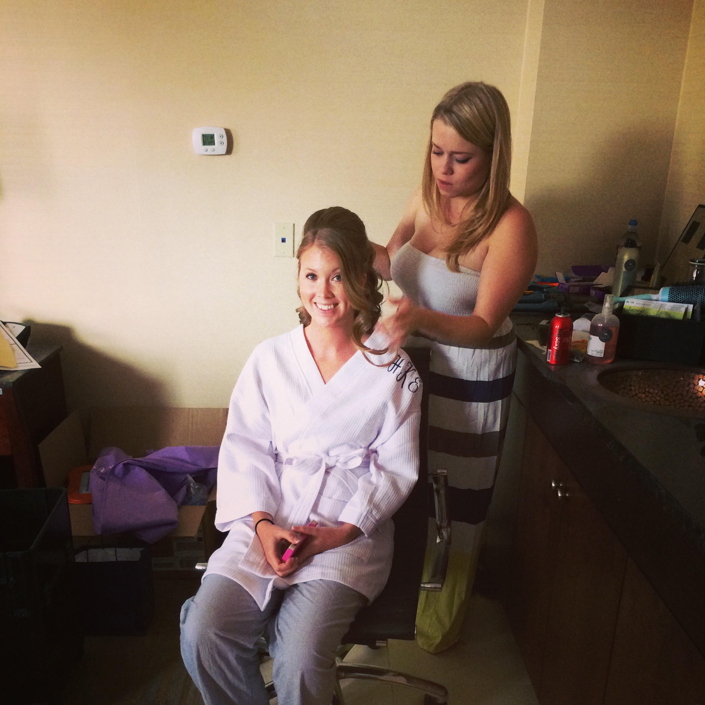 I think Hannah and I were up till close to 1 chatting so when 6:45 AM arrived, the first words out of my mouth were “Where’s Fletcher with that coffee?!” The two of us had breakfast at the hotel buffet — I think Hannah managed to eat half a piece of toast and one strip of bacon ha ha — then headed back upstairs to meet Josh’s mom Karla and Kellee who were first to get their hair and make up done. And yeah, Fletcher did eventually bring the coffee 🙂