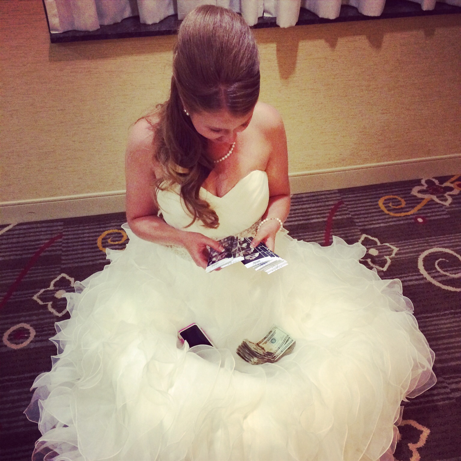 This is the aftermath of a wedding. A bride sitting on the hotel floor, a wad of cash and a pile of photo booth pictures. Sounds about right to me.