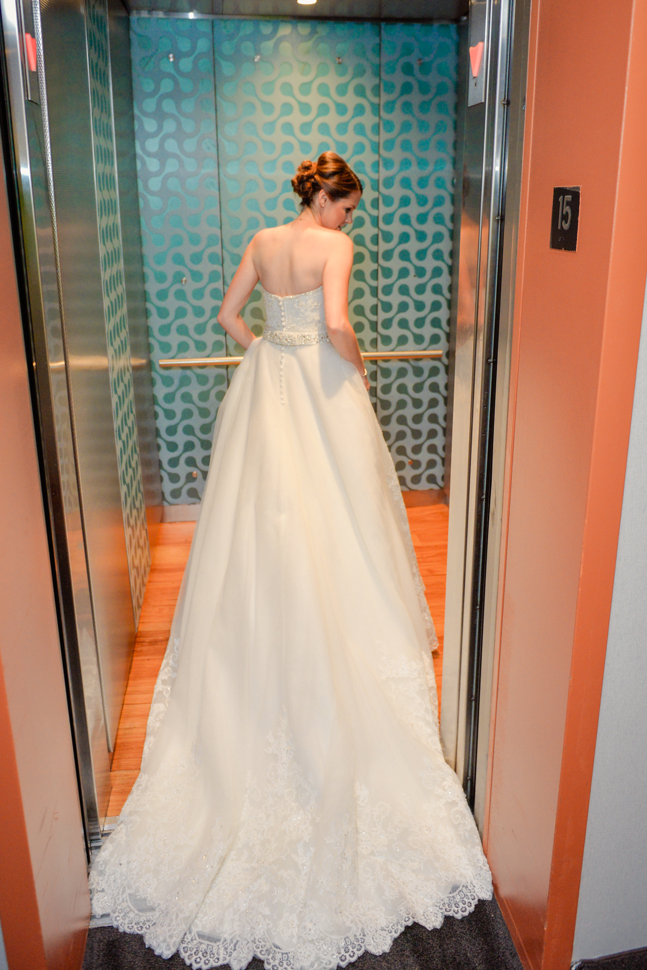 I hear my uncle wound up in the same elevator as my dress while our photographer was shooting this photo. How funny!