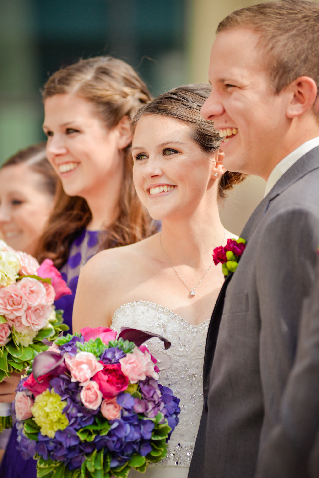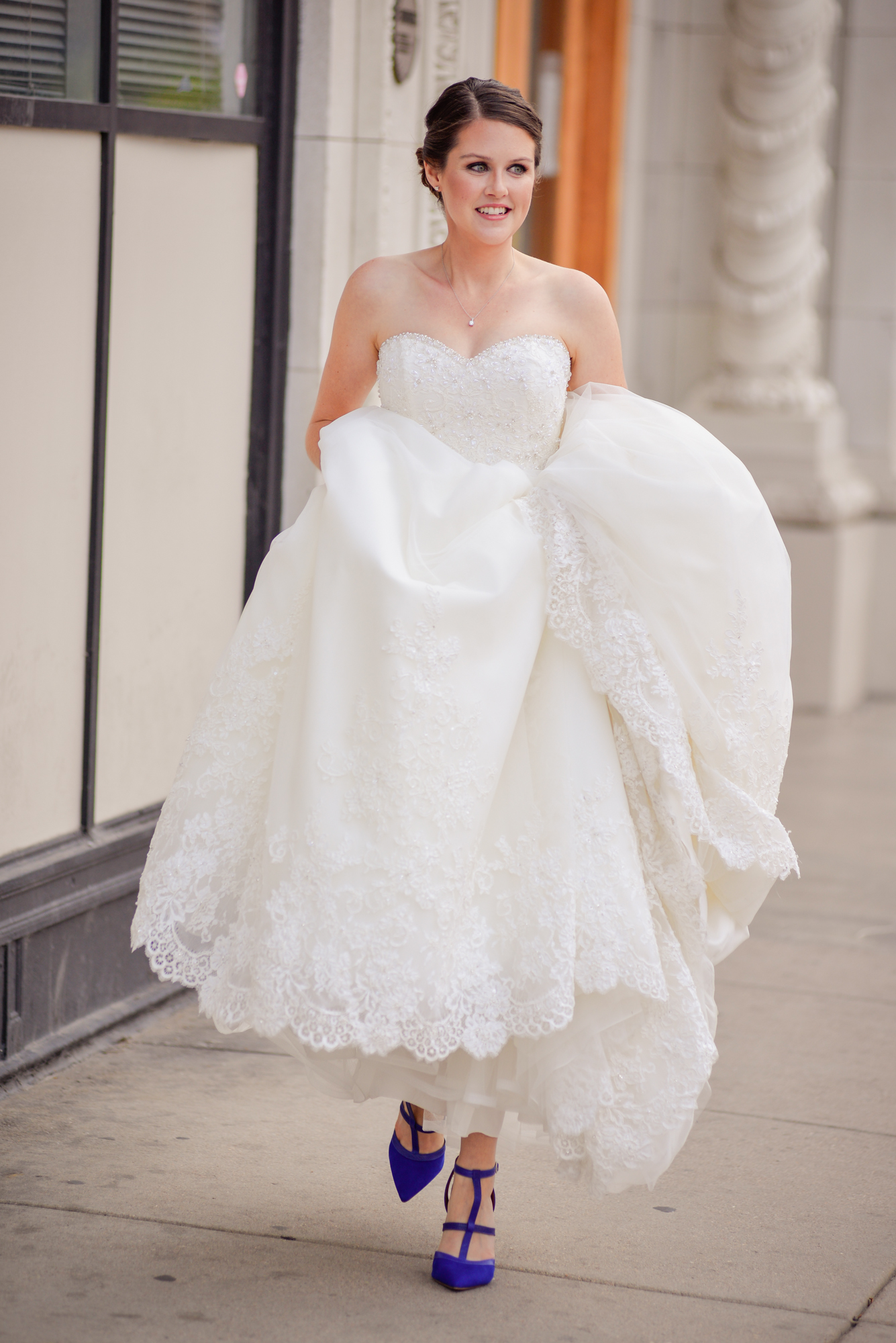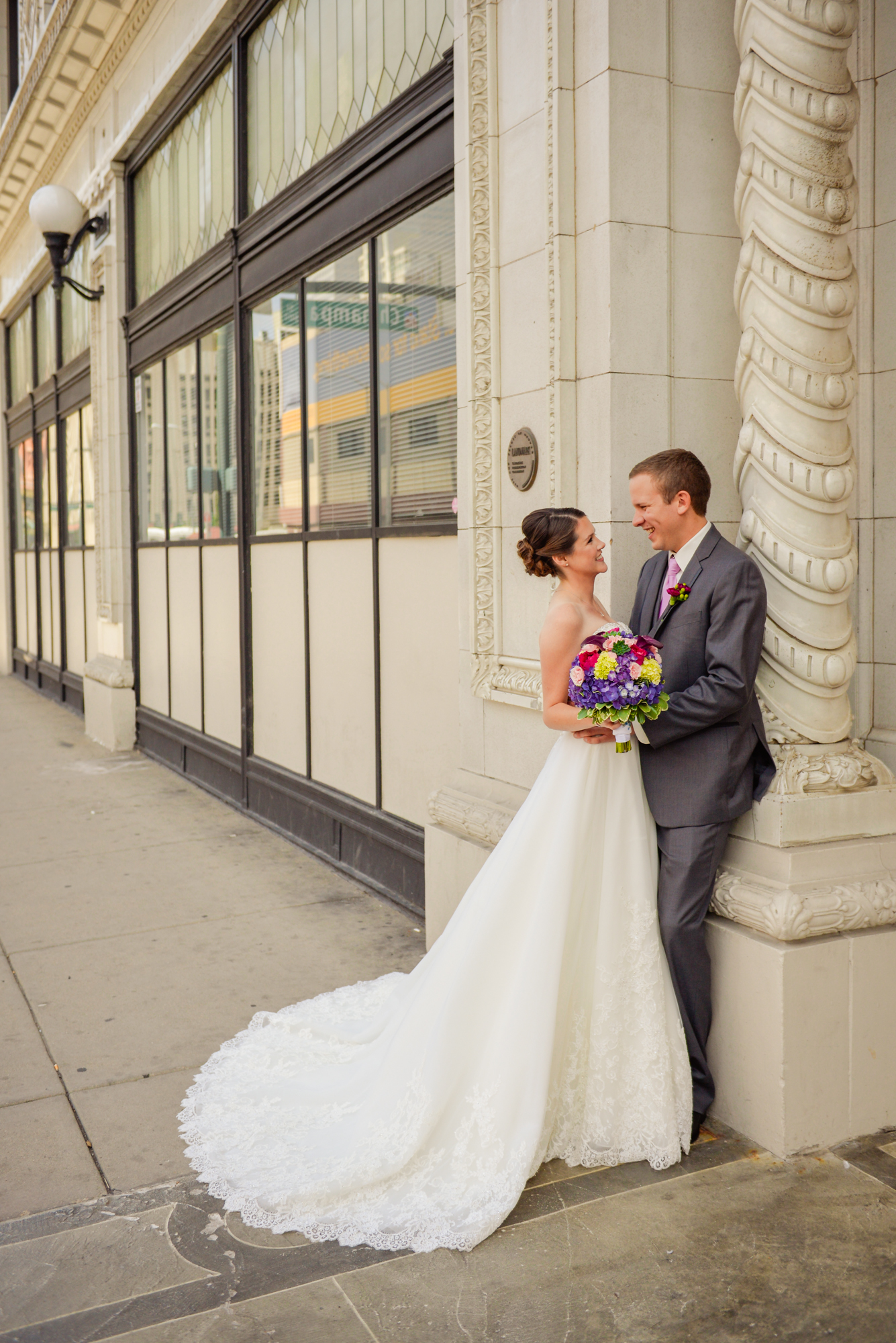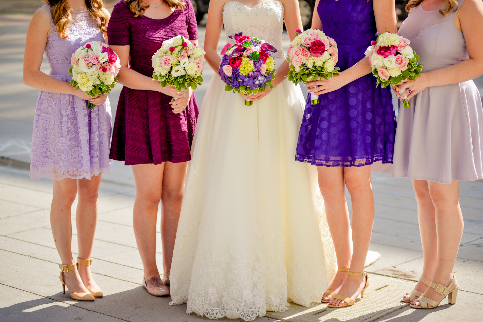 Oh my gosh! I love love love these photos with their cool urban backdrop. They are fabulous! I also love the fact that your bridesmaids are all where different colors. And I heart the bright blue shoes with your dress. You look absolutely beautiful. Can’t wait to see the rest of the pics! 🙂