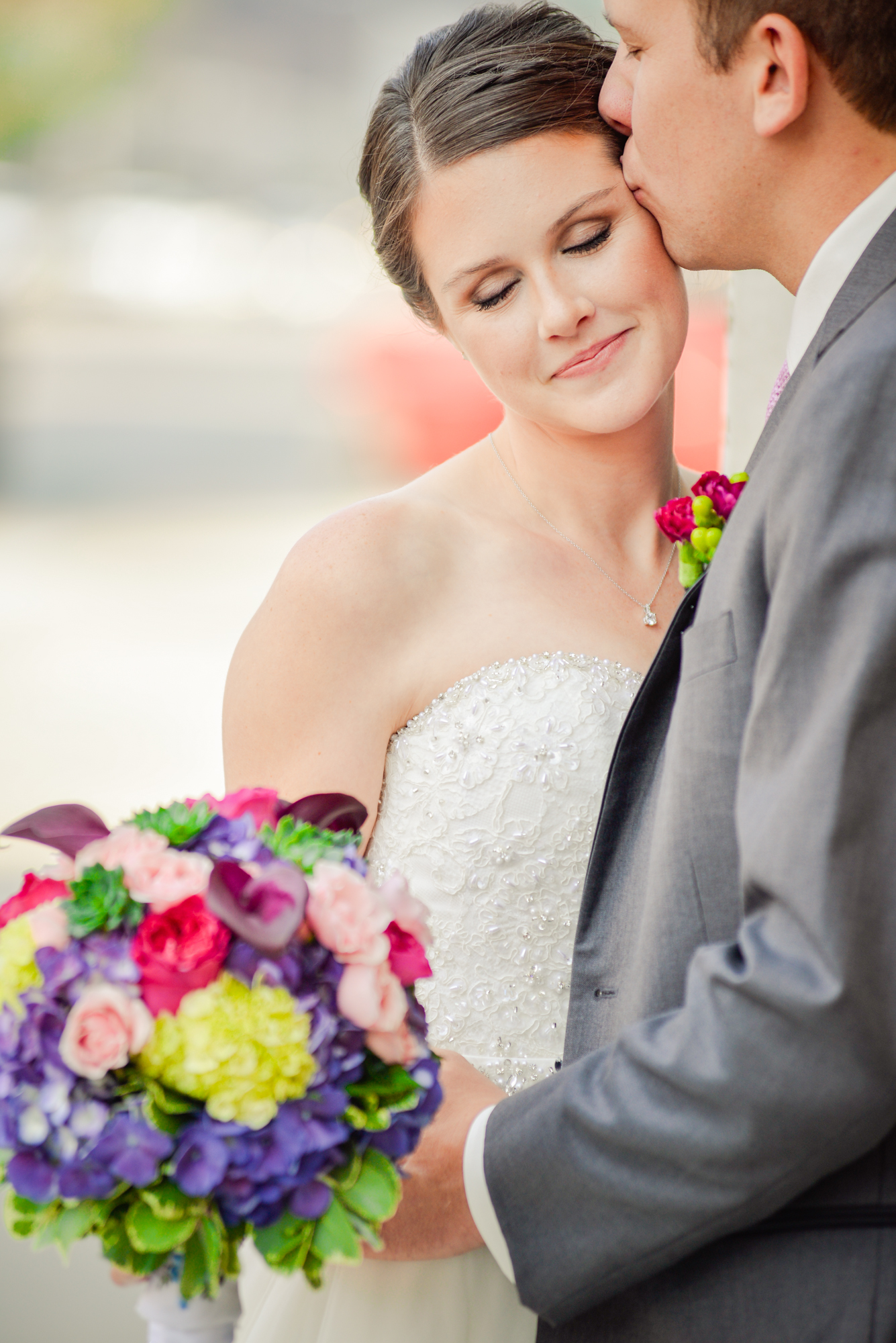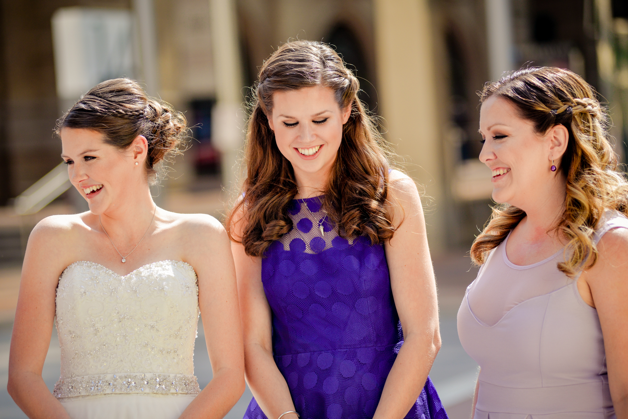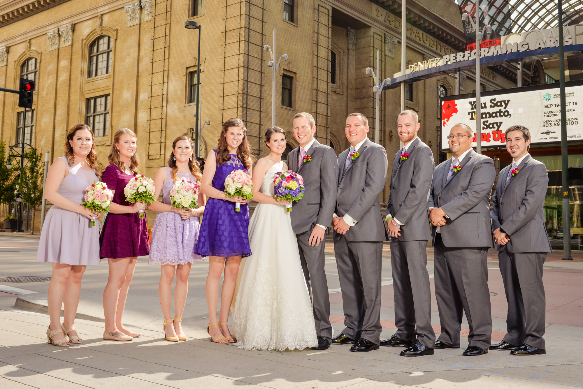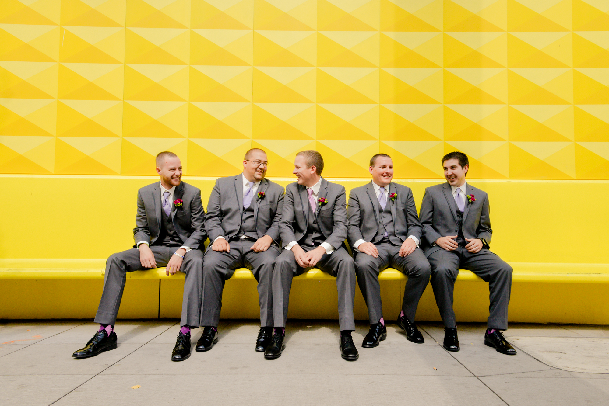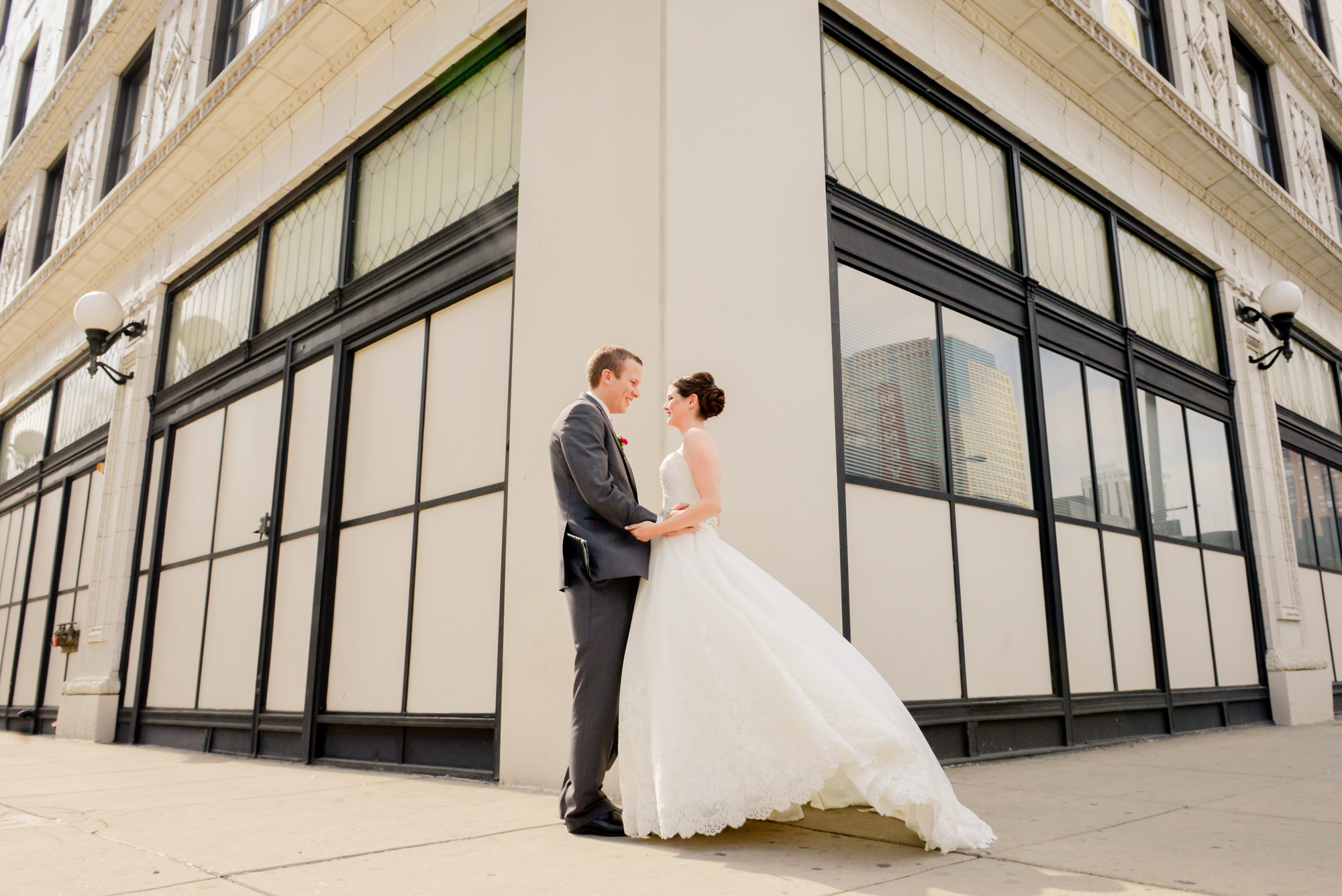 Oh my gosh! I love love love these photos with their cool urban backdrop. They are fabulous! I also love the fact that your bridesmaids are all where different colors. And I heart the bright blue shoes with your dress. You look absolutely beautiful. Can’t wait to see the rest of the pics! 🙂