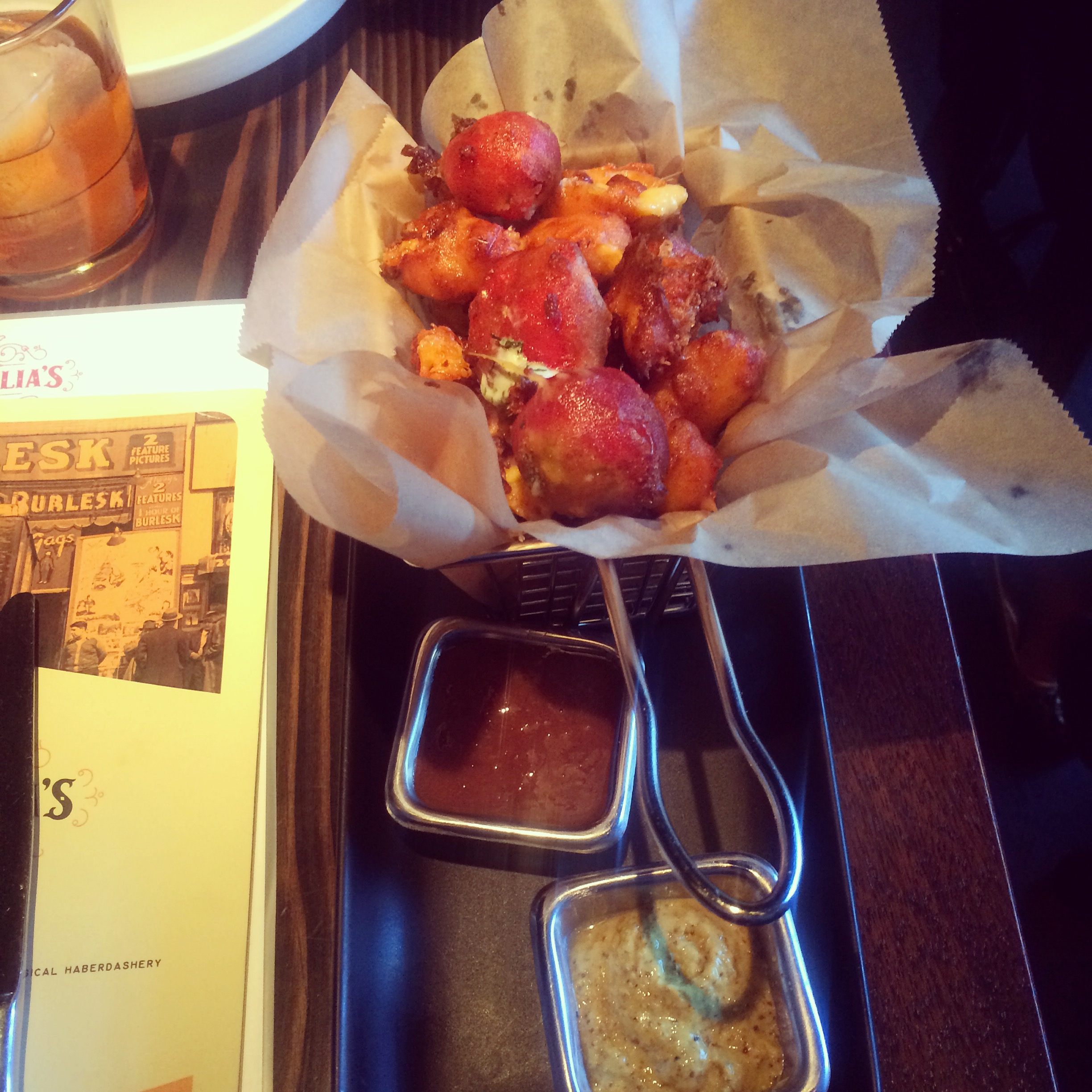 Second stop, cheese!  We split two starters to… uh start.  The first being Peppadew Poppers, stuffed with cream cheese and served with cheese curds, a blood orange marmalade and mustard dipping sauces.  Uh yes please.  It worked out perfectly because Joey was so into the peppers and I was so into the cheese curds.  Also, we got a huge kick out of that tiny fry basket.