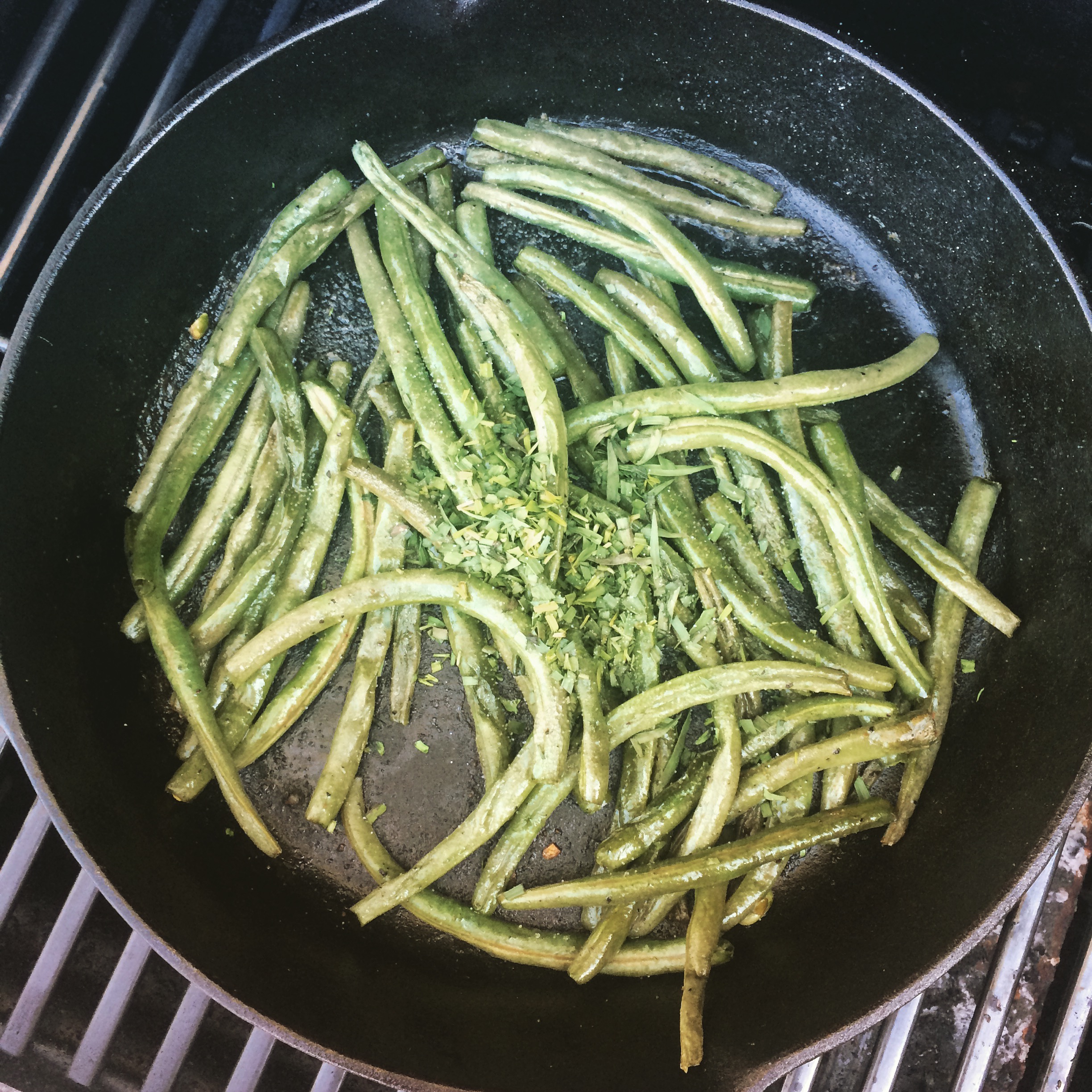 For the green beans, I decided to go the cast-iron skillet route. Mostly because we don’t own a grill basket, but partly because I felt all “home, home on the range” sautéing in a skillet over a flame. Do you think cowboys in the Wild West chopped up fresh tarragon to add to their butter-roasted green beans?? Alls I did was melt some butter and sauté the beans, then I added about 1/2 cup of vegetable broth, salt and pepper, closed the lid and let that liquid cook out before turning off the heat and tossing in a couple tablespoons of tarragon. Seriously, once you add tarragon, you’ll never go back.