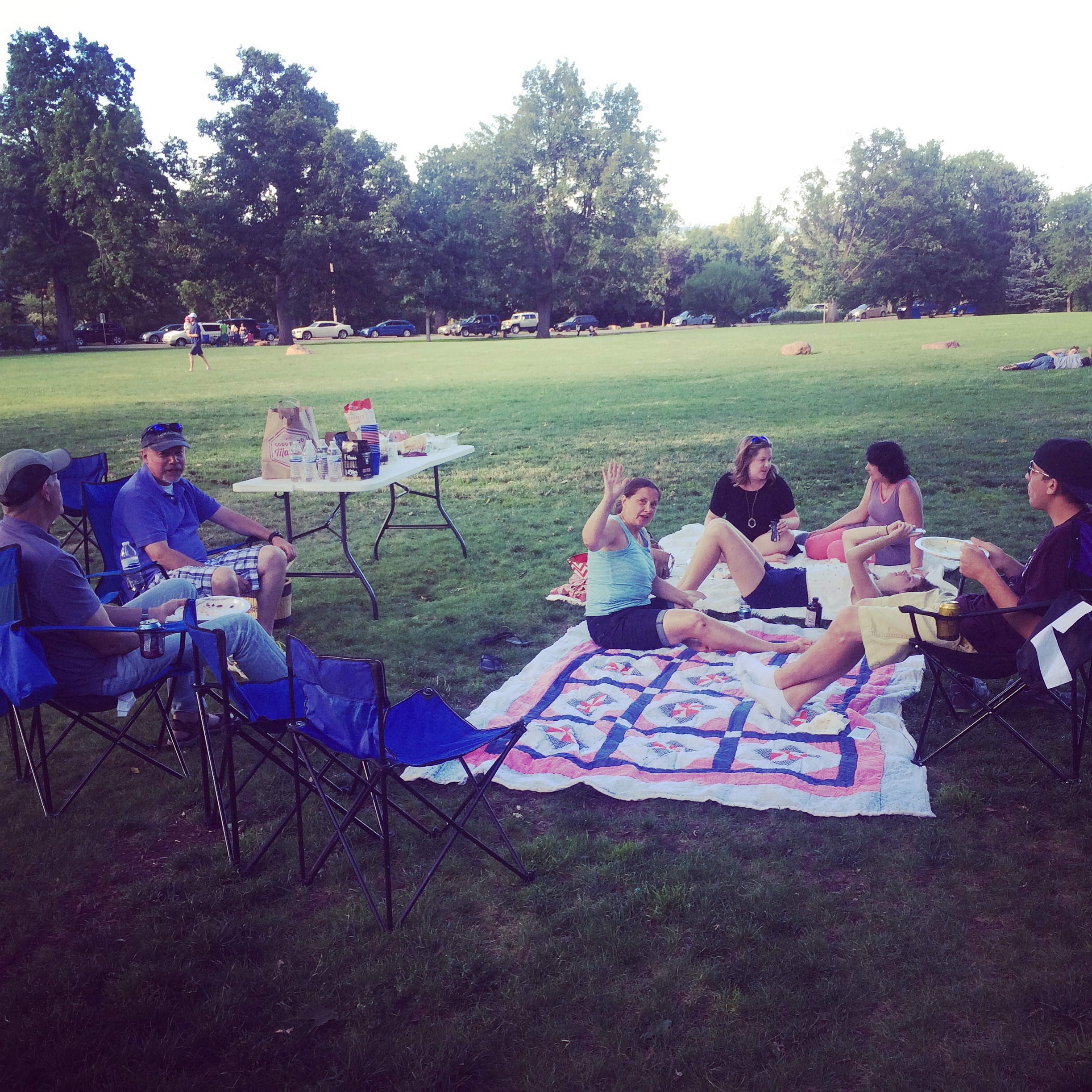 After a little bit of down time at my parents’ we all headed to Whole Foods to pick up stuff for a little Chautauqua picnic action. BBQ chicken, potato and pasta salad, chips and guac, roasted veggies and my personal favorite, broccoli crunch salad were all packed up then unloaded at our picnic site so we could dig in. Also: WINE IN A CAN. I’ll be real, that’s the only thing I really cared about having at the picnic. Priorities, people.
