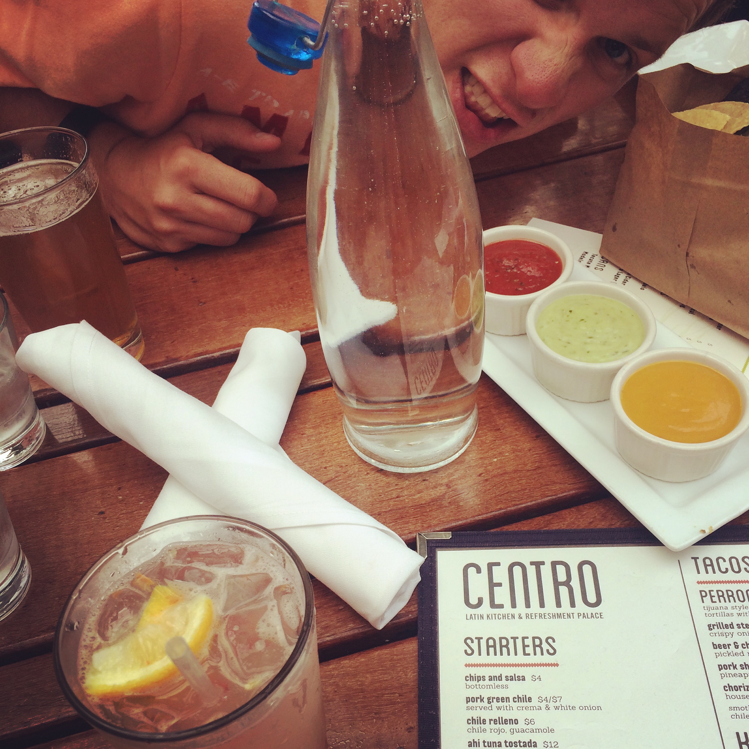 Since we were already in Boulder and since it was Friday, we decided to head to Pearl Street for the evening. Hannah and Josh were meeting us at Centro for some Happy Hour action, but we got there early so we wasted some time at this cute little book store, where I bought a copy of For Whom the Bell Tolls and Joey put himself in time out? We’re such adults. Then we grabbed a patio table and got down on some chips and salsa.
