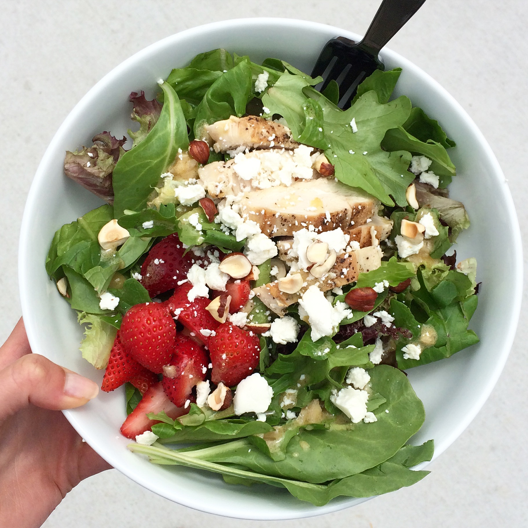I assembled this lunch salad at the office and everyone kept telling me how good it looked. Which is the total opposite of what they usually say about the lunches I bring. It’s just chicken breast slices, strawberries, goat cheese, hazelnuts and this simple vinaigrette, that’s totally my new go-to dressing. And you know what? That salad was pretty fricken good!