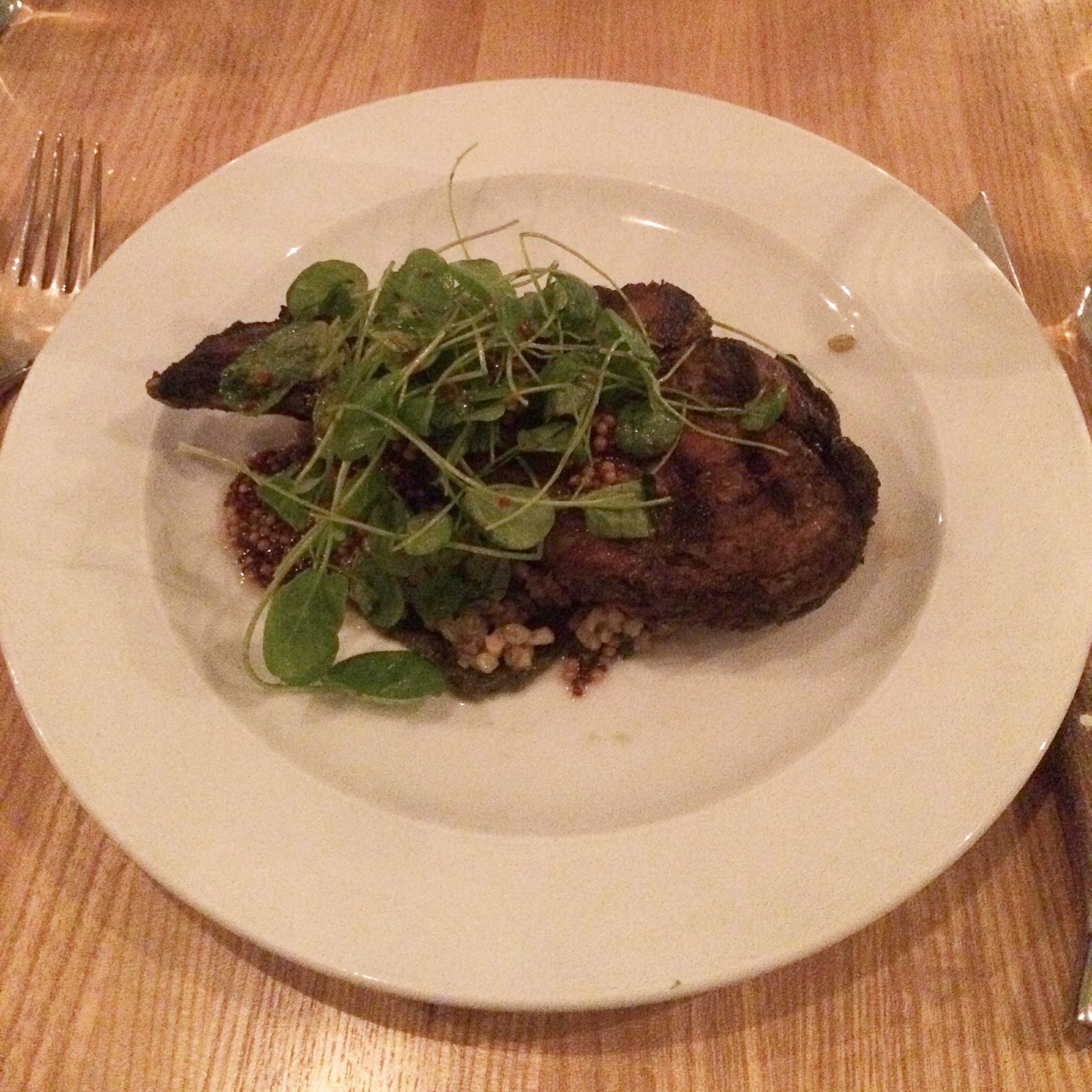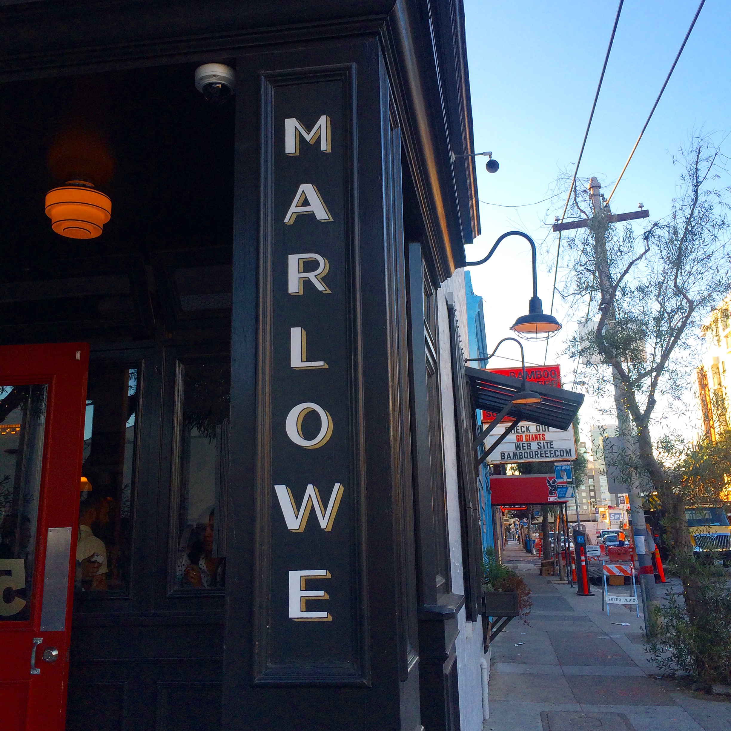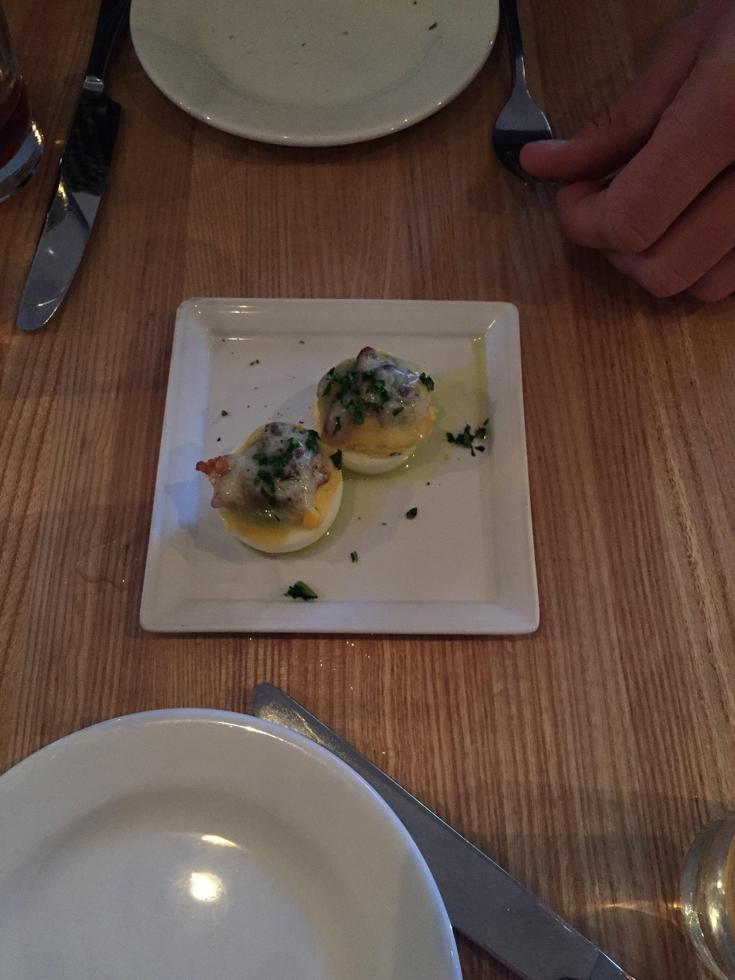 Post-field trip to the Tenderloin, we had dinner at Marlowe.  I guess I must’ve told them it was our anniversary because they gave us champagne when we got there.  So cute!  We got fried okra and a life-changing warm deviled egg to start.  That actually sounds kind of gross but it was SO GOOD.  Joey loved it and he doesn’t even like deviled eggs.  We shared pork chops for dinner and though I’m usually vehemently opposed to meal sharing, the table next to us had already gotten their food and the plates were seriously huge.