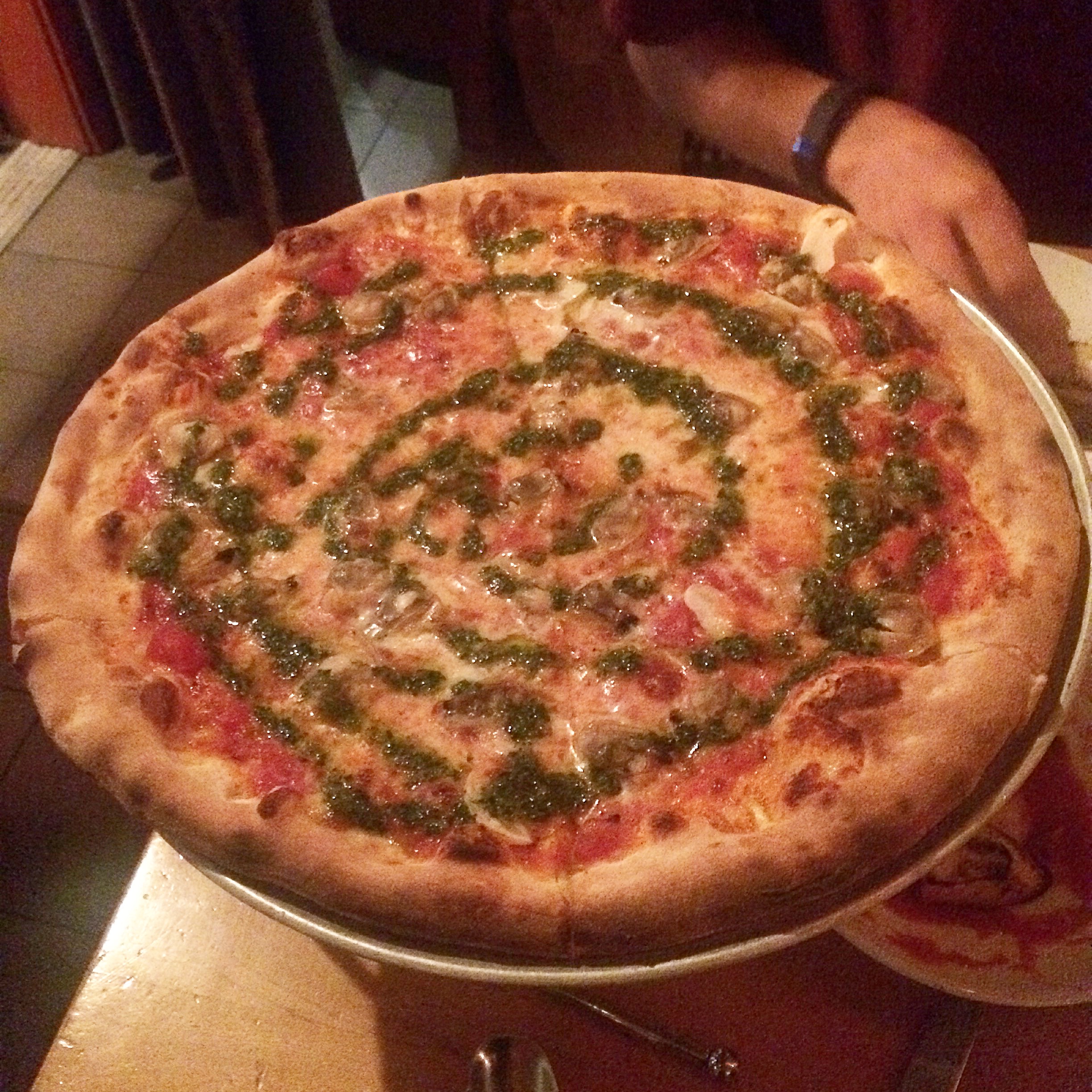 For dinner, we walked over to Chestnut Street, which is the cutest little strip of shops and restaurants and had dinner at Delarosa (totally took a picture of the sign the next morning so it wouldn’t be dark and ugly like the ones I took of our food).  It was teeny tiny in there but we only ended up waiting 10 minutes.  I finally found that watermelon beer I’ve been seeing around for years.  Go figure that it’s not even from California.  It tastes pretty good though!  We also shared meatballs and a clam pizza, which is my new favorite kind of pizza to order anytime I see it on a menu.
