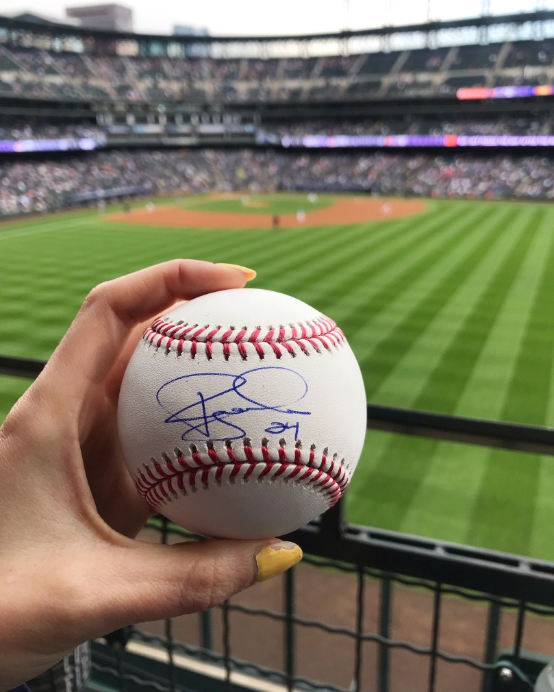 It recently occurred to me that while I’ve been to Biker Jim’s a million times, I’ve only tried maybe four of their dogs, so I’m now on a mission to try them all! I was mildly alarmed that Alaskan Reindeer was not listed on the menu as that’s my absolute favorite, but I’m hoping they were just out that day and it’s not a permanent change. Anyway, I tried the Jack-A-Lope and it was okay but a bit too spicy and also I couldn’t stop thinking about what it was made of. In other news, Rockies won by a lot and we got this Ryan McMahon-signed ball before the game started!