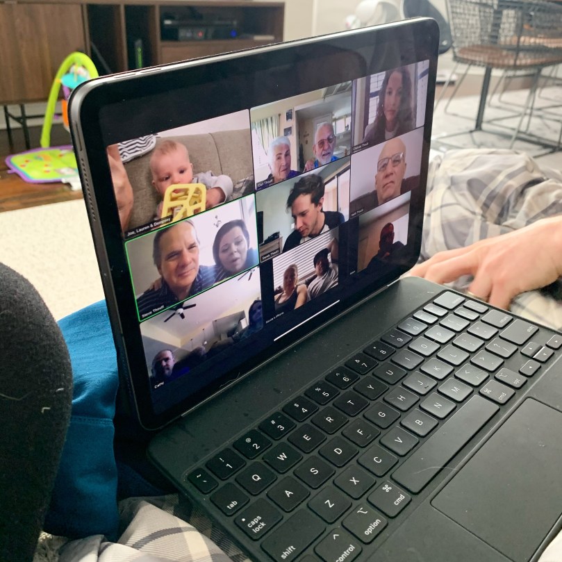 Sometimes we wake up in the morning and can hear Dempsey wiggling around and talking to himself in his bassinet and we always wonder just how long he’s been awake in there! We all cuddled in bed for a good while but then I started getting antsy to make breakfast. I cannot wait until he can stay awake for longer periods of time. His “wake window” always goes by too fast, so I was rushing to get breakfast made before his first nap. I didn’t make it but luckily, Joey got him down real fast and we didn’t have to re-heat any pancakes 🙂 Ricotta pancakes are the best! We had a family Zoom call at 9 and thought it was sad Dempsey would be missing it, but then he woke back up, so we let him join the call before putting him back down. It was really nice to “see” everyone. It’s been SO long since we were all together.