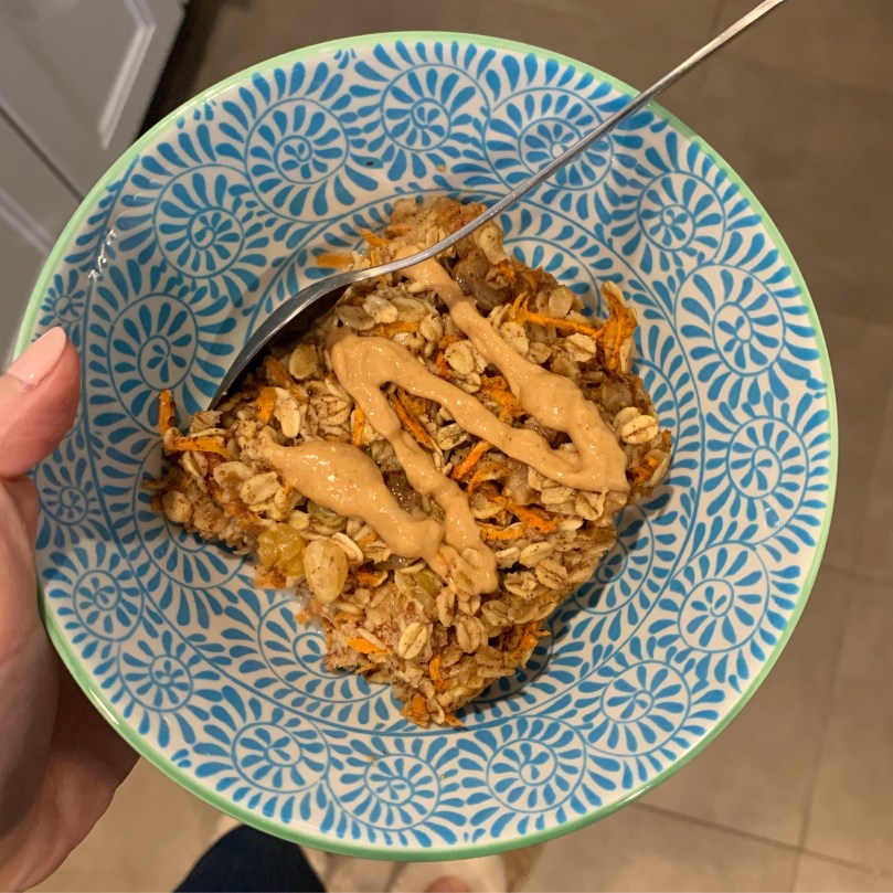 I made carrot cake baked oatmeal! What is it about spring that makes me only want to eat carrot cake-flavored things?? Italian carrot cake, carrot cake baked oatmeal, carrot cake waffles/pancakes. I know I have a carrot cake overnight oat recipe someplace but I’ll wait until it’s not 40 degrees to break that one out. As for the baked oatmeal, tastes like a delicious cobbler almost?? I love it!