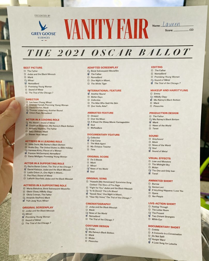 Dempsey took a nap as soon as we got home and when he woke back up, we made blackened salmon for dinner and helped him fill out his Oscars ballot. He went with some strange picks but I wished him the very best of luck! As for the show, my favorite moments were Yuh-Jung Youn’s speech (Brad, social distancing be damned, help that woman off the stage!!!), Daniel Kaluuya “mentioning” his parents (or more like his mom’s reaction to him “mentioning” them 😂), Bong Joon-ho announcing Chloé Zhao as Best Director and, of course, Glenn Close being a comedian. But there were some really strange decisions made during this show. Why were they awkwardly showing the nominees instead of clips of the films or the makeup/hairstyling or the production design?? A lot of people haven’t seen all of these movies, so show them what they’re missing! And, of course, the decision to do Best Picture before Best Actress and Actor is just baffling to me. We figured they wanted to end with Chadwick Boseman since he has basically swept the rest of the award shows but do the producers not know who’s going to win beforehand?? If not, what a terrible gamble! That being said, Anthony Hopkins is so good in The Father. Till next year, Oscars!
