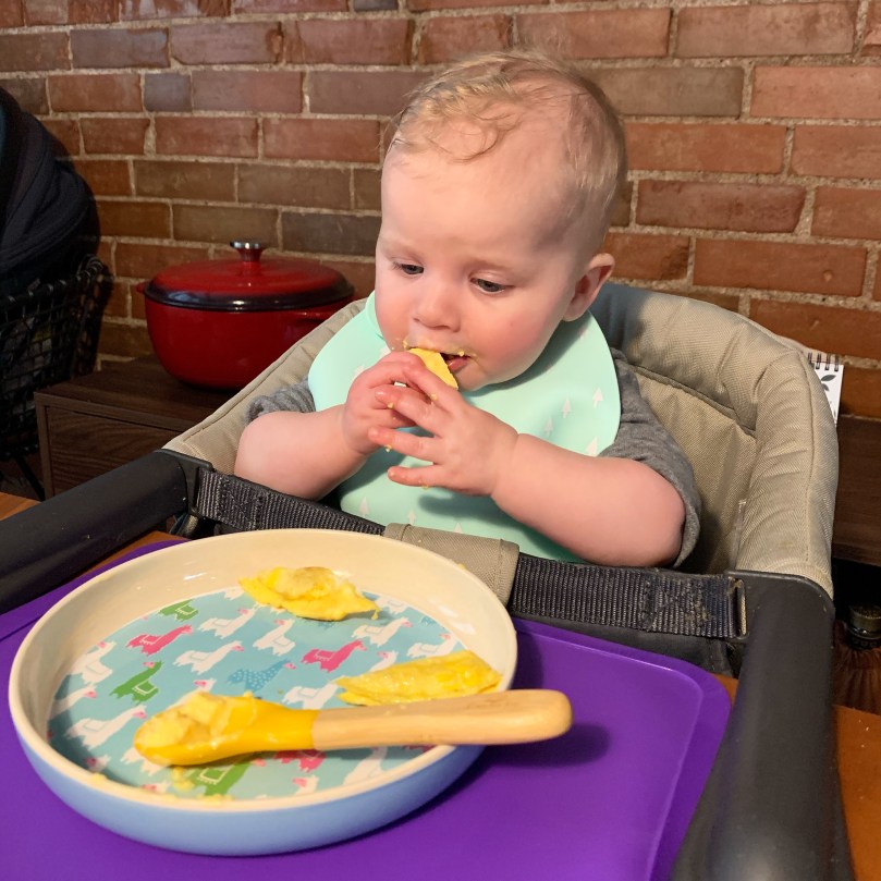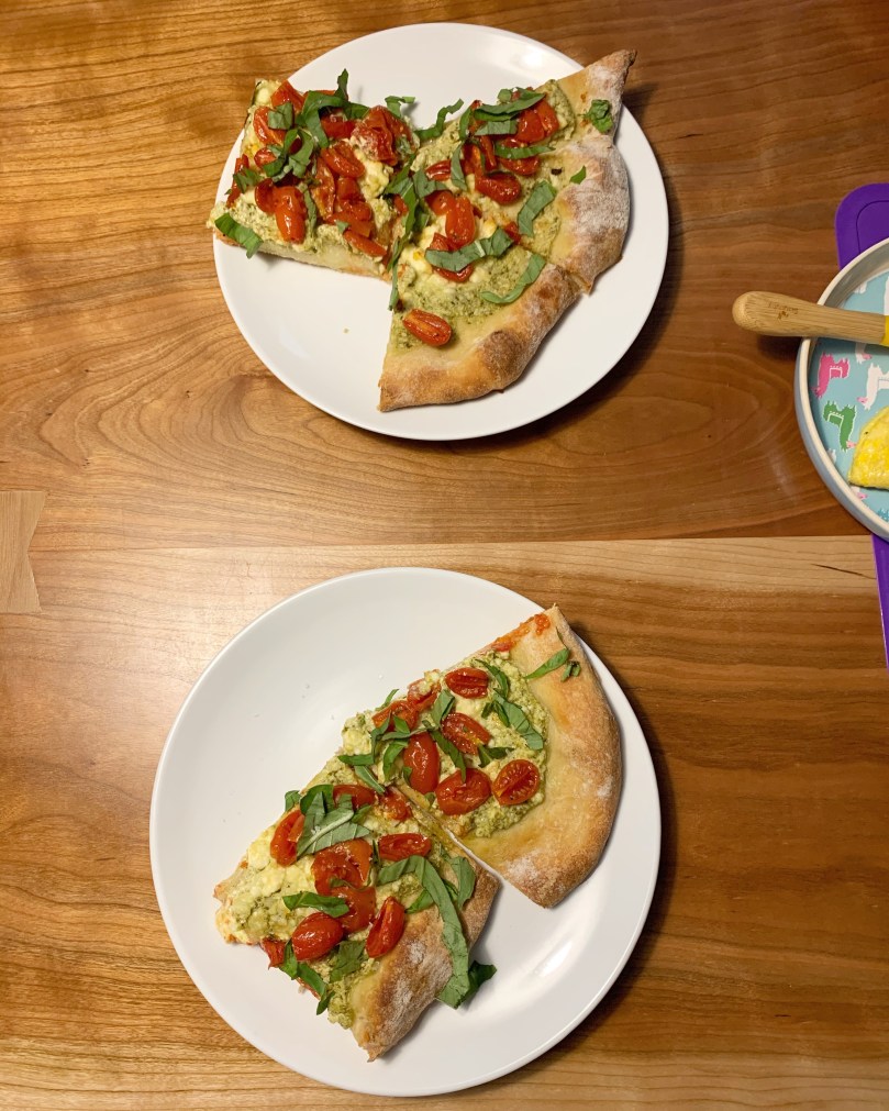 Would you look at those baby teeth?! I keep forgetting to mention that he has two, because he put up ZERO FUSS when they came in. As in, one morning, he put my hand in his mouth and I said “um, I feel a tooth in there!” We had no idea that was happening. A second one came in a couple of days later. Praying to every deity that the rest come in as painlessly! We fed him egg for the first time that night and, KNOCK ON WOOD, so far so good. Aka no allergic reaction! He was really into gnawing on those omelet strips and it was too cute. He’s been so good with everything we’ve fed him so far and it’s been so fun watching him feed himself. We fed ourselves some tomato-ricotta pizza and that was fun too. I can’t wait until he can eat a tomato-ricotta pizza with us! We put him to bed and watched two episodes of Ted Lasso and damn if that show doesn’t feel good and wholesome.