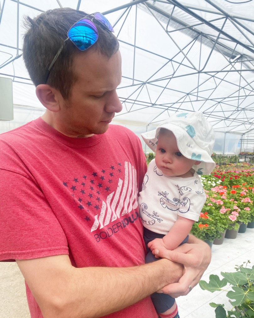 Post Dempsey Nap #1, we took a trip to Elliott Gardens for the first time! Our usual garden store closed, so we needed a replacement and I really liked it there! Demps was a hit with all the other customers and can you blame them?? He looked too cute in that bucket hat. We left with a ton of flowers and some seeds for the veggie garden. We decided to re-do the garden bed in our back yard and I’m soooo glad we did, because it looks so pretty. My mom got me a rose bush for Mother’s Day and we bought a peony and two Columbines, so wish me luck on growing all of those things for the first time! Hoping that ground cover spreads fast. Dempsey got a little time on the porch swing and he loves it as much as I do π