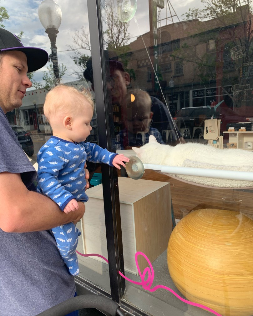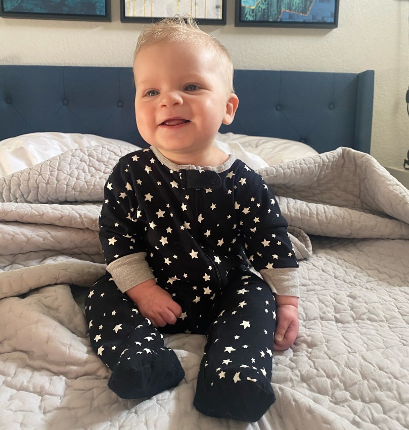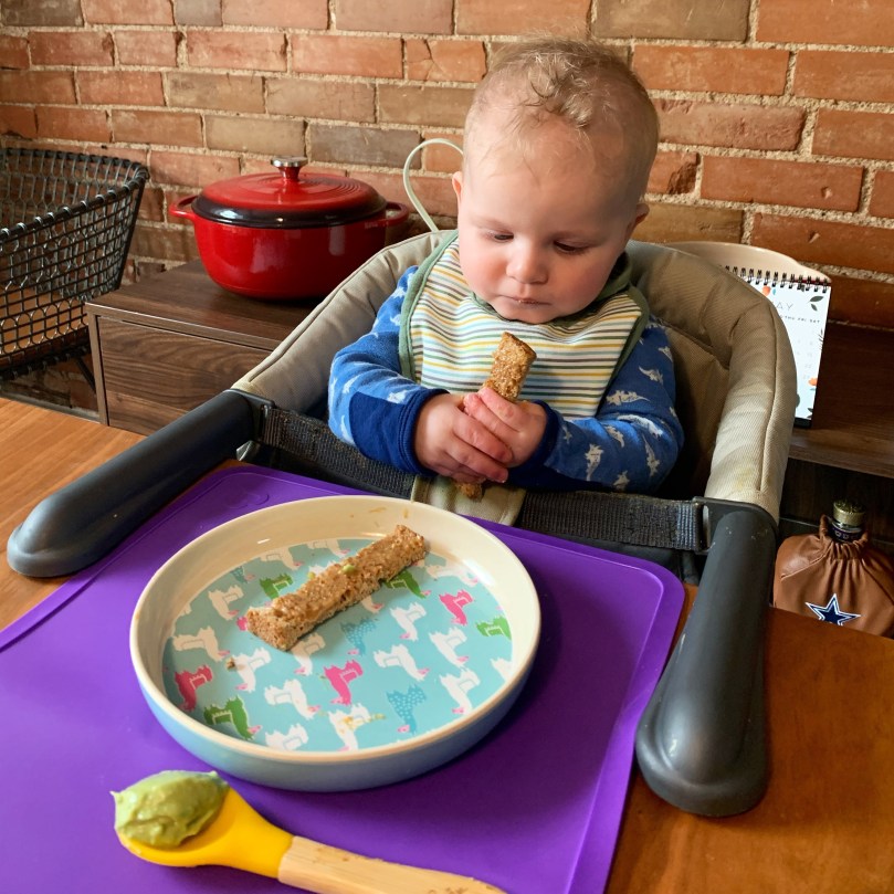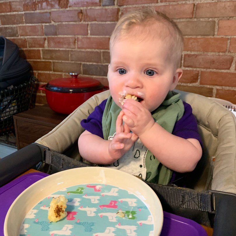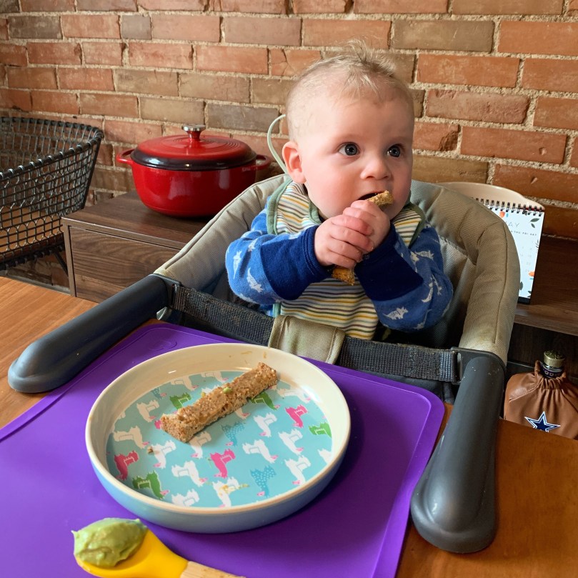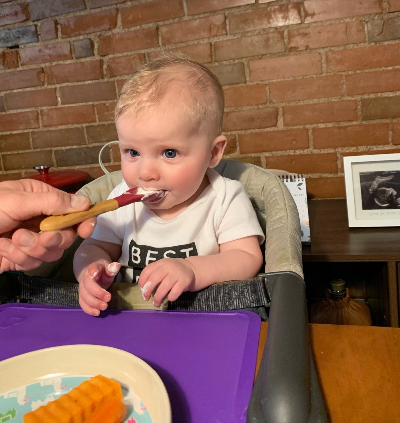 Another Friday, another walk to the coffee shop. The baristas were maskless for the first time since last June and it was truly weird to see the bottom of their faces for the first time! Dempsey was outside with Dad trying to pet a cat through the glass 😂 The work day was sort of chaotic for Joey and I but we did fit in baby’s first peanut butter toast and he was very into it! A boy after my own heart with peanut butter, ya know?? ❤ We’ve started feeding him “lunch” in addition to dinner and even though it one more mess to clean up, I don’t mind. Also, we’ve still been doing a puree/solid food combo and not going to lie, we mainly spoon the puree into his mouth ourselves. He CAN hold the spoon, but it’s just way less messy if we give him a little help 🙂