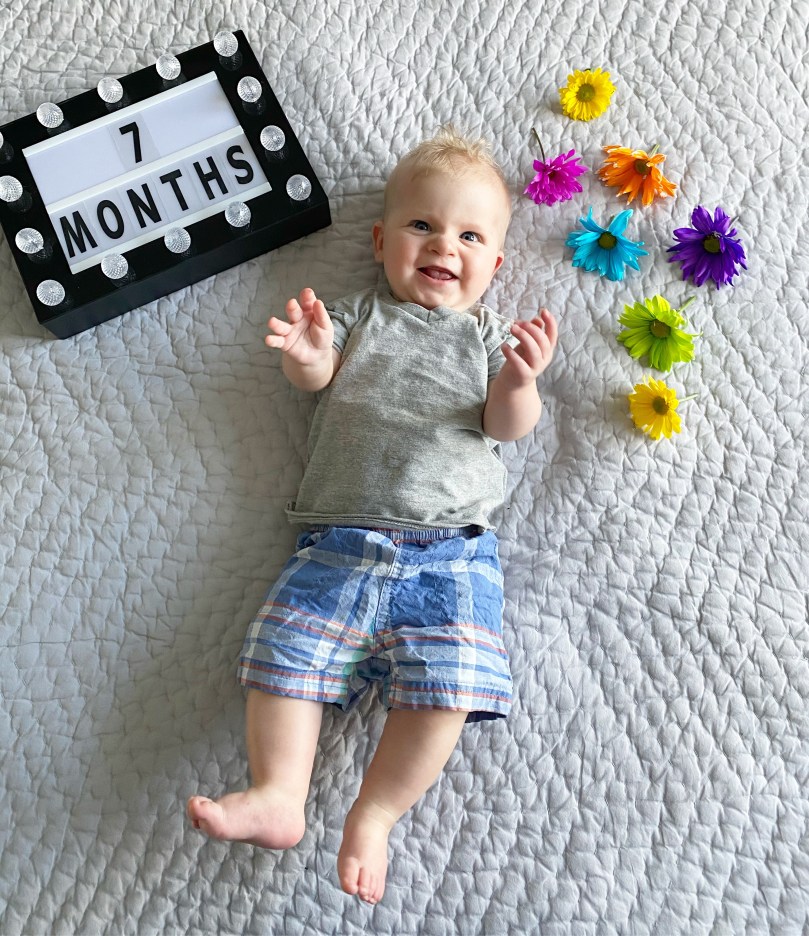 Dempsey is 7 months old!!!! 🎉🎉🎉 When the heck did that happen?? I think I’ve said this every month, but this is already my favorite month. His little personality (which is so exuberant!) is absolutely infectious and I love seeing just so many smiles and hearing so many noises and when he wraps his little arms around my neck, I just about die! He loves to sit and stand (with some help 😋) and if you have a button or a zipper or a string or a necklace, he will see it and he will grab it (and most likely put it in his mouth…). He is a great sleeper, a great eater and just an all-around joy❤ Wow, all that happiness made me forget I cut the corner of my finger off chopping bacon yesterday but then my throbbing finger reminded me I cut the corner of my finger off chopping bacon yesterday…