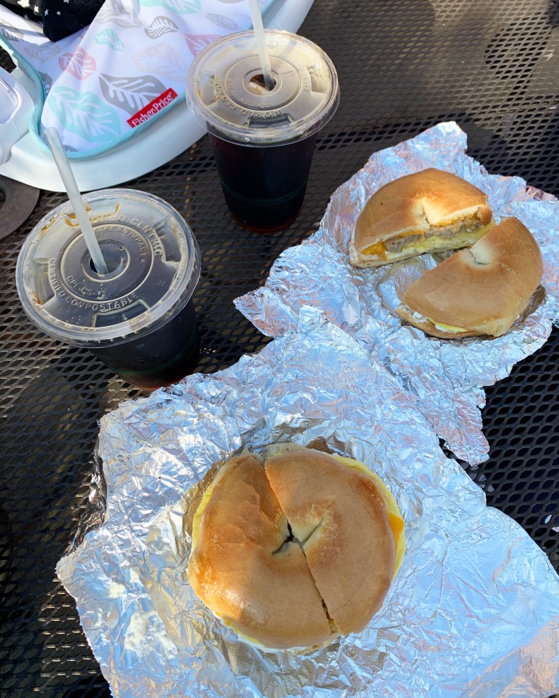 Good morning from the cutest face I’ve ever seen! Joey and I got double bagel sandwiches and iced coffee and since Dempsey slept in later than usual (🙌), he sat outside with us while we ate. We maybe tried to fit too many things into the rest of the day, including bathroom cleaning, some food prep for us and for Dempsey, a trip to my sis’s, and a second baby nap so that we didn’t make it to the Rockies game until the fifth inning, OOPS!!! I honestly didn’t realize we were that late until we got into our seats. It was windier than I would have liked but a baby on your lap will keep you warm. That baby was overtired by the time we got back home and Joey sure had some trouble getting him down for that last nap 😥 Meanwhile, I was making us a sheet pan tofu and veggie dinner. Demps had more yogurt and then we tried cauliflower again and he liked it way more than last time!