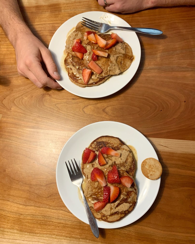 Saturday morning almond butter pancakes were a huge hit with Dempsey. I think he ate four?! Please note his new cheek bruise too. He is FEARLESS on our bed and we are constantly trying to catch him before he flings himself off of it but I was just a second too slow and he faceplanted on my nightstand π¬ I think I was more sad about it than he was though.