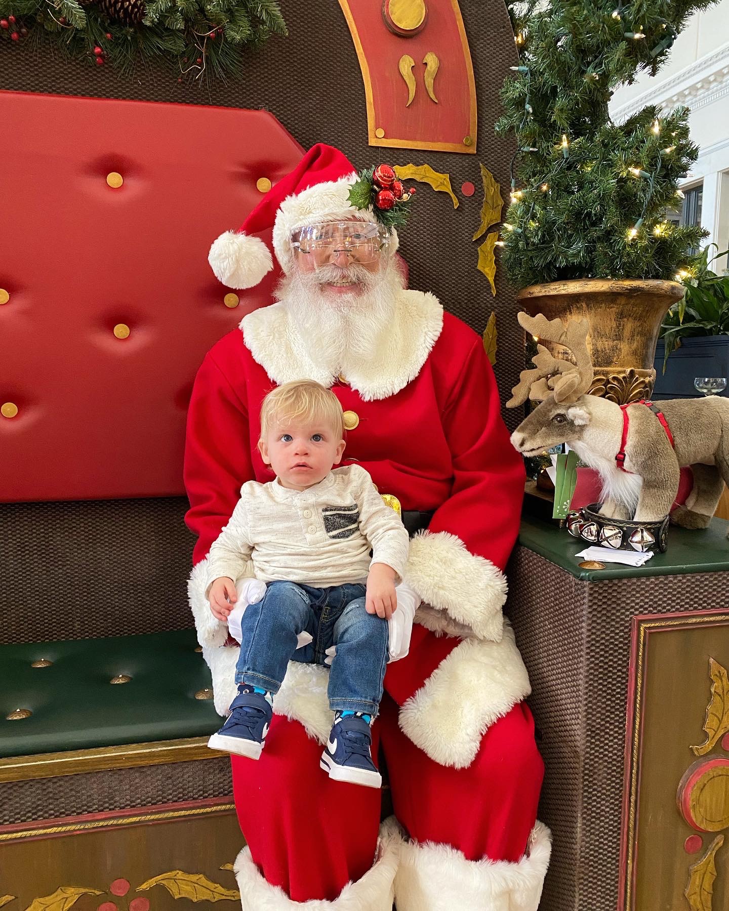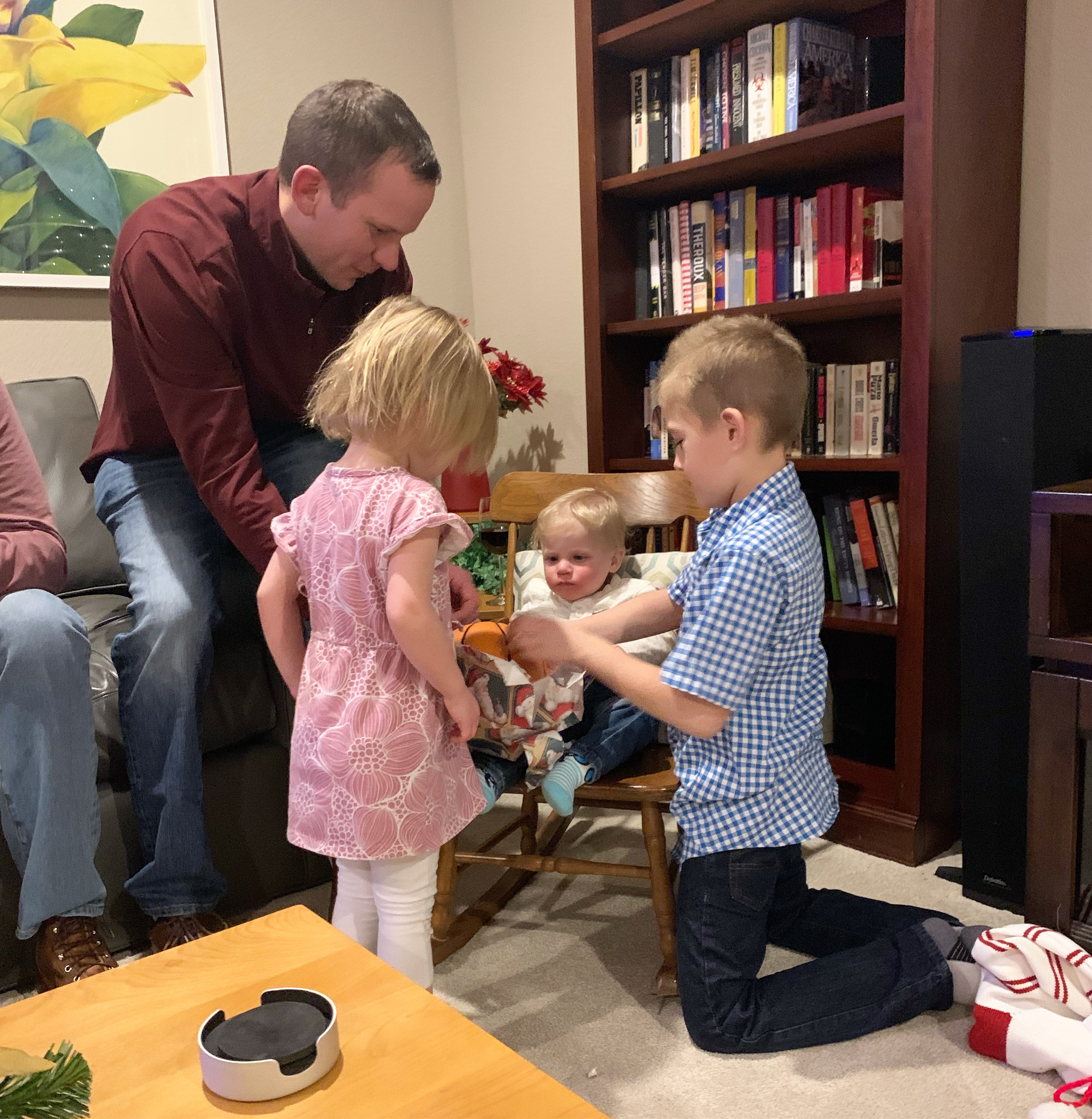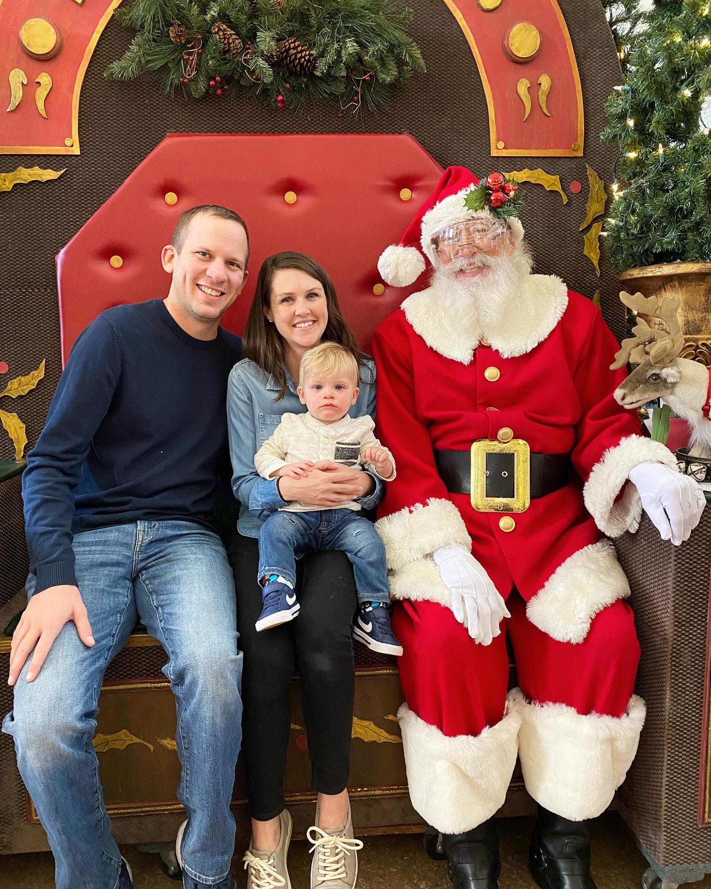 Christmas Day! Dempsey slept in till 8:15!!!! I am pretty sure that is the last Christmas morning sleep in we’ll get until he’s 18 πππ We’ll take it! After being out of the house early on Christmas morning for the past couple of years, being able to be home till 2 PM felt like such a luxury. We unwrapped presents as a family and Santa brought Dempsey that cute chair. He did so good ripping off wrapping paper and pulling stuff out of his stocking β€ He roamed all over the living room afterward, playing and having fun and hey, that was fun for us too! Tried for so long to take that family photo (ugh, Dempsey’s swollen eyes from his rash…) but he did not want to sit still.