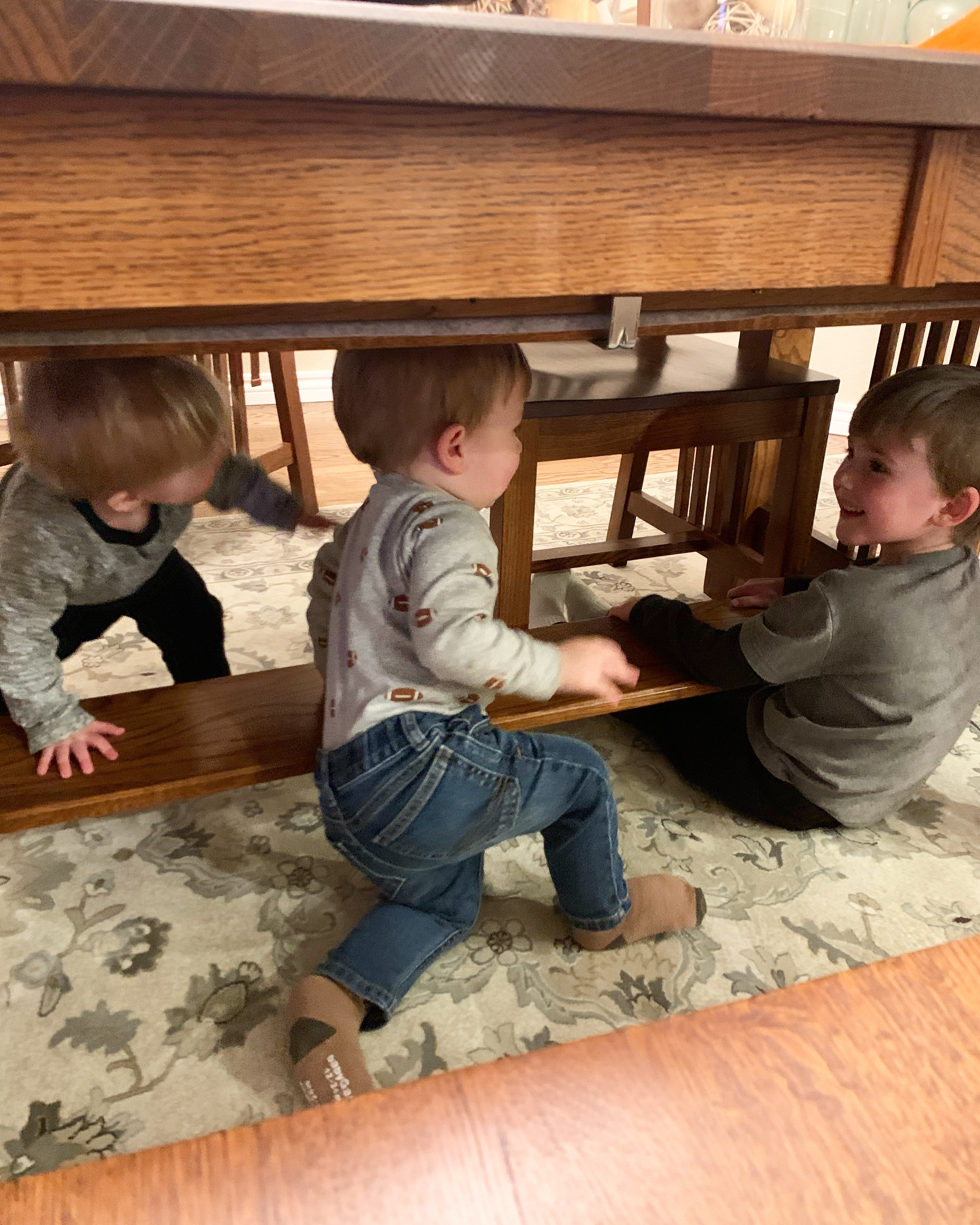 Just some Super Bowl shenanigans! I think Dempsey enjoyed playing with all of Henry’s toys π Darron and Karla had such a good spread, per usual! Loved those spicy wings and actually, so did Dempsey (just the inside non-spicy parts though π)! Mason and I played a few rounds of Crazy Eights and he wanted me to take that picture of him posing like the frog statue. Why’s he so funny?! Particularly enjoyed Dempsey wandering around with that foam sword and using it like a vacuum?? Wonder where he’s seen that? π€£ And when all the boys climbed underneath the table and were in their own “baby restaurant.” Too much fun! So nice to be back at this party after missing it in 2020 and 2021! Demps fell asleep in the car but he was such a trooper staying up past his normal bedtime. I love him very much.